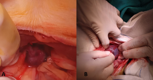 Anaesthesia was induced by IV administration of Propofol (Propofol-lipuro 10 mg/ml, 10 ml ampoule, Braun) at a dose of 6 mg/kg before endotracheal intubation. Maintenance of anaesthesia was provided with Sevoflurane (Sevorane liquid, 250 ml vial, Abbvie) oxygen mixture. Access to the abdominal cavity was performed via a ventral midline incision in dorsal recumbency. The distended bladder was carefully removed manually from the sacral region and repositioned to its normal place in the abdomen (Fig. 3). Intraoperatively, the outer surface of the bladder appeared fragile and showed a dark red discoloration, with some regions more severely affected. Neither a structural abnormality of the organs nor any other herniated structures were observed in the abdominal cavity. Intraoperative catheterization of the urinary bladder was performed, and the bladder was rinsed with 0.9% NaCl solution. Ventral abdominal cystopexy was performed using a simple interrupted pattern, and the abdomen was closed routinely. Postoperatively, antibiotics, analgesics, and fluid therapy were continued. On the 2nd day postoperatively, swelling of the right sacral region and severe tenesmus and pain were observed, and it was determined that the bladder was herniated again on ultrasound. The patient was re-operated. Intraoperatively, the bladder stitches appeared ruptured, and the outer surface of the bladder was even darker red and fragile. It was observed that the bladder colour began to return to normal after repositioning. The urinary bladder was fixed by the ventral abdominal cystopexy method using a continuous locking suture technique. Haematuria was detected on the first postoperative day of the repeated operation, but the patient's general condition was good. On the 2nd postoperative day, the urine returned to normal, and the patient was discharged. However, the day after discharge, the patient owner informed us that the patient had died. Our request for a necropsy to determine the cause of death was declined.