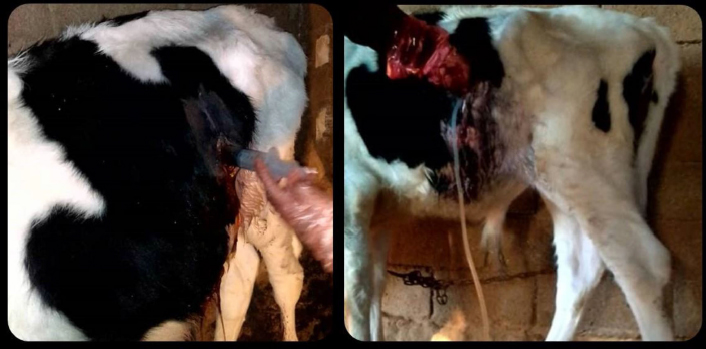 Fig. 2. The laparotomy procedure performed on the young bull for urachus evacuation and washing and abscess drainage. The site preparation and local anaesthesia (left) and the drainage tube (right).