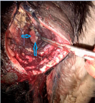 Fig. 3. Urachal abscess localization after an exploratory laparotomy. Arrows indicate the site of the urachal abscess. ConclusionThe current report documented a rare condition of urachal abscess in a young bull based on the clinical presentation and exploratory surgery. The diagnosis of such conditions requires some relatively more advanced diagnostic imaging techniques, namely, contrast radiography and CT scan. Those methods were unfortunately not available but the clinical signs and the laparotomy surgery confirmed the diagnosis. This affection was treated using simple, cost effective and relatively non-invasive surgical technique with great success. The case was followed-up for almost 2 months post-surgery until complete recovery and the bull became clinically normal. AcknowledgmentsSpecial thanks to all the staff of Anatomy, Histology and Embryology Department for their contributions in this work. ReferencesAbdelhadi, J.M. and Oheida, A.H. 2021. Herniorrhaphy in two newborn lambs with omphalocele. Open. Vet. J. 11(4), 667–671. Barrell, E.A., Burton, A.J., Arroyo, L.G., Saulez, M.N., Beasley, E.M., Schott, H.C. and Dodd, C.C. 2020. Chapter 34-diseases of the renal system. In Large animal internal medicine. Eds., Smith, B. P., Van Metre, D. C. and Pusterla N. 6th ed. St. Louis, MO: Mosby, pp: 956–1005.e1009. Basta, M. and Lipsett, B.J. 2021. Anatomy, abdomen and pelvis, umbilical cord. In: StatPearls [Internet]. Treasure Island (FL): StatPearls Publishing; PMID: 32491321. Begg, R.C. 1930. The urachus: its anatomy, histology and development. J. Anat. 64(Pt 2), 170–183. Bhatia, A., Shatanof, R.A. and Bordoni, B. 2021. Embryology, gastrointestinal. In: StatPearls [Internet]. Treasure Island (FL): StatPearls Publishing; PMID: 30725857. Charles, A. K. and Faye-Petersen, O.M. 2014. Human placental development from conception to term. In Pathobiology of human disease. Eds., McManus, L. M. and Mitchell, R.N. San Diego, CA: Academic Press, pp: 2322–2341. Laverty, P.H. and Salisbury, S.K. 2002. Surgical management of true patent urachus in a cat. J. Small. Anim. Pract. 43(5), 227–229. Lipskar, A.M., Glick, R.D., Rosen, N.G., Layliev, J., Hong, A.R., Dolgin, S.E. and Soffer, S.Z. 2010. Nonoperative management of symptomatic urachal anomalies. J. Pediatr. Surg. 45(5), 1016–1019. Nguyen, H.T. and Cilento, B.G. 2010. Bladder diverticula, urachal anomalies, and other uncommon anomalies of the bladder. In Pediatric urology. Eds., Gearhart, J. P., Rink, R.C. and Mouriquand, P.D.E. Philadelphia, PA: W.B. Saunders, pp: 416–424. Parsons, D.A. 2009. The newborn foal. In Equine breeding management and artificial insemination. Eds., Samper, J.C. Saint Louis, MO: W.B. Saunders, pp: 261-276. Qureshi, K., Maskell, D., McMillan, C. and Wijewardena, C. 2013. An infected urachal cyst presenting as an acute abdomen-a case report. Int. J. Surg. Case Rep. 4(7), 633–635. Rich, R.H., Hardy, B.E. and Filler, R.M. 1983. Surgery for anomalies of the urachus. J. Pediatr. Surg. 18(4), 370–372. Schott, H.C., Waldridge, B. and Bayly, W.M. 2018. Disorders of the urinary system. In Equine internal medicine. Eds., Reed, S.M., Bayly, W.M. and Sellon, D.C. 4th ed. Philadelphia, PA: W.B. Saunders, pp: 888–990. Visser, J., Kummeling, A., van Nugteren, M.A., Grinwis, G.C.M. and Brocks, B.A.W. 2020. Resection of urachal anomalies in dogs with recurrent lower urinary tract disease. Vet. Surg. 49(1), 214–221. Wang, Y. and Zhao, S. 2010. Vascular biology of the placenta. San Rafael, CA: Morgan and Claypool Life Sciences. PMID: 21452443. Wilson, A.L., Gandhi, J., Seyam, O., Rahmani, B., Patel, S., Joshi, G. and Khan, S.A. 2019. Urachal anomalies: a review of pathological conditions, diagnosis, and management. Transl. Res. Anat. 16, 100041. | ||