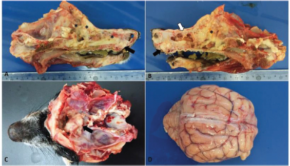Fig. 1. Macroscopic findings in a 14-year-old dog with transitional nasal carcinoma with meningoencephalic invasion. (A) Sagittal cut of the face, right view: whitish mass originating from the oral vestibule invading the hard palate (black arrow) and yellowish white friable material observed at the beginning of the nasal cavity until the regions of ethmoid and frontal cells and sinuses (*). (B) Sagittal cut of the face, left view: whitish mass originating from the oral vestibule invading the hard palate (black arrow); infiltrative mass associated with necrotic tissue that extended from the dorsal meatus of the nasal cavity (white arrow) to the cribriform plate (*). (C) Cross sectioning of the skull. Whitish mass, cranial to the optical nerve in the olfactory bulb region showing the rupture of the cribriform plate due to the neoplasm. (D) Brain with moderate vessel disclosure.