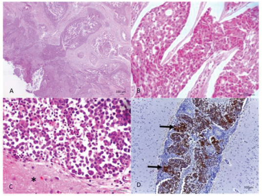 Fig. 2. (A) Oral neoplasm showing epithelial proliferation of the mucosa with papillary projection into the submucosa, forming trabeculae and nests with corneal pearls and acantholytic cells in the center. Hematoxylin and eosin. Scale bar=100 micrometers. (B) Nasal cavity neoplasm, where rounded epithelial cell nests are observed showing eosinophilic cytoplasm, round nucleus and evident nucleolus. Hematoxylin and eosin. Scale bar=50 micrometers. (C) Meninges, adjacent to the brain tissue (*), with neoplastic infiltration from the transitional carcinoma. Hematoxylin and eosin. Scale bar=50 micrometers. (D) Marking for cytokeratin-7 in the neoplastic cells (arrow) in the meninges and vessels. Cytokeratin-7 immunolabeling. Scale bar=100 micrometers. Ethical approvalData used in this manuscript were obtained from the Veterinary Hospital Prof. Ricardo Alexandre Hippler, at University of Vila Velha (ES, Brazil). This case was part of the clinical routine. Your necropsy and study were approved by the owner and hospital direction, respectively. All procedures were in accordance with institutional guidelines (University of Vila Velha). DiscussionAlthough scarcely reported in the literature, it is concise that most primary nasal cavity and sinus neoplasms are malignant (Confer and de Paoli, 1978; Mukaratirwa et al., 2001; Ninomiya et al., 2008; Lemetayer et al.,, 2017). The reported dog had transitional cell carcinoma in the nasal cavity and sinus, this being the second most frequently diagnosed tumor in this location (Ninomiya et al., 2008). The clinical picture presented by animals affected with nasal neoplasms and brain invasion is extremely extensive. Epistaxis, mucopurulent nasal discharge, seizures, mydriasis, vestibular dysfunction, and blindness are some of the symptoms described (Confer and de Paoli, 1978; Rassnick et al., 2006; Snyder et al., 2008; Lemetayer et al., 2017). Facial deformity is a common finding since when affecting the nasal cavity and sinus, malignant epithelial neoplasms, in general, have an invasive behavior and lead to the destruction of the region's bone structures (Rassnick et al., 2006). In the present case, both signs related to the respiratory system as well as the nervous system were observed, ratifying the extensive symptoms presented, due to the fact that they cover two distinct sites. Necropsy and histopathological evaluation are of extreme importance in the diagnosis of the condition, as observed in the present case. However, immunohistochemistry, with antibodies for cytokeratin in general and cytokeratin 19, is an important technique in aiding the diagnosis of neoplasms of epithelial origin (Ninomiya et al., 2008). The intense neutrophilia with a left shift evidenced in the reported dog, characterized a leukemoid reaction. This condition is frequently observed in dogs affected by malignant epithelial neoplasms (Sato et al., 2012), whereas this fact, associated with the nasal cavity's chronic inflammatory process, may justify the leukocytosis presented by the animal. In conclusion, the present report describes a rare case of transitional carcinoma of the nasal cavity as well as the frontal and ethmoidal sinuses with brain invasion, confirmed by immunohistochemistry. Walking in circles, motor incoordination, right eye ventrolateral strabismus and decreased facial sensitivity on the left side were neurological signs presented by the animal. Dyspnea and epistaxis were evidenced respiratory signs. The presence of an epidermoid carcinoma in the same animal's oral cavity suggests how much domestic animals are exposed to carcinogens present in the urban environment. It is extremely important for veterinarians to include neoplasms in their differential diagnoses, when these animals show chronic respiratory signs and neurological alterations that do not improve with appropriate treatment, always associating with complementary exams, for correct diagnosis establishment and prognosis formulation. Conflict of interestThe authors declare that they have no conflict of interest. Author’s contributionLeonardo Gorza, Ayisa Oliveira, Isabela Hardt, and Mayra Flecher performed the necropsy and histopathological description. Luciana Maestri was the clinician of the case. Leonardo Gorza, Tayse Souza, Vania Santos, Maryleydy Porto, and Mayra Flecher wrote the manuscript. All authors reviewed the manuscript and made important contribution to the text. ReferencesConfer, A.W. and De Paoli, A. 1978. Primary neoplasms of the nasal cavity, paranasal sinuses and nasopharynx in the dog. A report of 16 cases from the files of the AFIP. Vet. Pathol. 15, 18–30. Lemetayer, J., Al-Dissi, A., Tryon, K. and MacDonald-Dickinson, V. 2017. Primary intranasal melanoma with brain invasion in a dog. Can. Vet. J. 58, 391–396. Mukaratirwa, S., Linde-Sipman, J.S. and Gruys, E. 2001. Feline nasal and paranasal sinus tumors: clinicopathological study, histomorphological description and diagnostic immunohistochemistry of 123 cases. J. Feline Med. Surg. 3, 235–245. Ninomiya, F., Suzuki, S., Tanaka, H., Hayashi, S., Ozaki, K. and Narama, I. 2008. Nasal and paranasal adenocarcinomas with neuroendocrine differentiation in dogs. Vet. Pathol. 45, 181–187. Rassnick, K.M., Goldkamp, C.E., Erb, H.N., Scrivani, P.V., Njaa, B.L., Gieger, T.L., Turek, M.M., McNiel, E.A., Proulx, D.R., Chun, R., Mauldin, G.E., Phillips, B.S. and Kristal, O. 2006. Evaluation of factors associated with survival in dogs with untreated nasal carcinomas: 139 cases (1993–2003). J. Am. Vet. Med. Assoc. 229, 401–406. Reif, J.S., Bruns, C. and Lower, K.S. 1998. Cancer of the nasal cavity and paranasal sinuses and exposure to environmental tobacco smoke in pet dogs. Am. J. Epidemiol. 147, 488–492. Sato, T., Shida, T., Maruo, T., Kawamura, H., Yamada, T., Ito, T., Takeda, H., Sugiyama, H., Ishikawa, T., Madarame, H., Kayanuma, H. and Suganuma, T. 2012. Primary lung carcinoma with paraneoplastic leukocytosis in a dog. J. Japan. Vet.