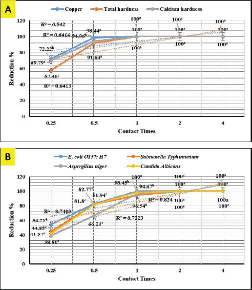 In-vitro adsorption and antimicrobial efficaciesEichhornia crassipes 1% suspension reveals in Figure 1A 100% adsorption (chelating) activity (p < 0.01) for copper (Cu+2, df=44, F=444.8, and p=0.000) and total (df=44, F=6,124.5, and p=0.000) and calcium (df=44, F=5,549.7, and p=0.000) hardness after 1-hour. Eichhornia crassipes 1% suspension also reveals in Figure 1B 100% killing (antimicrobial) efficacy (p < 0.01) against E. coli O157: H7 (df=119, F=13,843.9, and p =0.000), S. Typhimurium (df=119, F=2,595.2, and p =0.000), A. niger (df=119, F=7,738.1, and p=0.000), and C. albicans (df=119, F=8,773.4, and p=0.000) after 1, 2, 2, and 2-hour respectively.