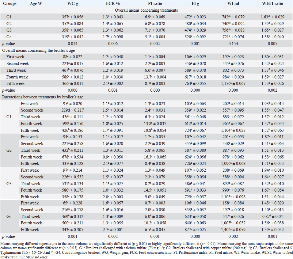 Fig. 1. In-vitro adsorption and antimicrobial efficacy (Reduction percentage Mean ± SE) of E. crassipes 1% suspension. (A) Chemical adsorption action. Initial levels of total hardness=2,100 mg.l-1 CaCO3, calcium hardness=1,600 mg.l-1 CaCO3, and copper=5 mg/l. (B) Microbial survival. Initial levels of E. coli O157: H7=1.7 × 1011 CFU.ml-1, Salmonella Typhimurium=1.5 × 106 CFU.ml-1, A. niger =2.5 × 108 CFU.ml-1, and C. albicans =2.5 × 108 CFU.ml-1 Growth traitsEichhornia crassipes 1% treated water reveals in Table 2 highly significant (p < 0.01) improvements of WG (df=3, F=11.1, and p=0.000), PI (df=3, F=35.8, and p=0.000), WI interactions (df=12, F=22.8, and p =0.000), WI/FI ratio (df=3, F=48.9, and p=0.000), FCR (df=3, F=24.5, and p =0.000), and FI (df=3, F=47.1, and p=0.000) in all treated broiler groups compared to the control. The overall means concerning age reveal in Table 2 highly significant (p < 0.01) improvements of WG (df=4, F=987.3, and p =0.000), FCR (df=4, F=120.6, and p =0.000), and PI (df=4, F=843.2, and p=0.000) in the fourth week, an d WI (df=4, F=1,021.8, and p=0.000) in the second week, as well as, highly significant (p < 0.01) decreases in FI (df=4, F=4,914.4, and p =0.000) in the second week. Live birds’ weights and carcasses traitsEichhornia crassipes 1% treated water reveals in Table 3 highly significant (p < 0.01) increases in LBW (df=3, F=191.1, and p=0.000) in G3 (broilers challenged with S. Typhimurium) compared to other challenged groups and the control. Carcass weights (CW, Table 3) reveal highly significant (p < 0.01) increases (df=3, F=256.2, and p=0.000) in G1 (broilers challenged with calcium sulfate) and G2 (broilers challenged with copper sulfate) with no significant differences between the two groups. Liver (df=3, F=126.0, and p=0.000), heart (df=3, F=89.8, and p=0.000), and spleen (df=3, F=355.3, and p=0.000) weights reveal highly significant (p < 0.01) increases in G3 compared to all other groups (Table 3). Bursa's weights (Table 3) reveal highly significant (p < 0.01) increases (df=3, F=348.0, and p=0.000) in G3 and G2 with no significant differences between the two groups. Table 2. PIs (Mean ± SE) in different groups supplied with E. crassipes treated water (1 g.l-1).