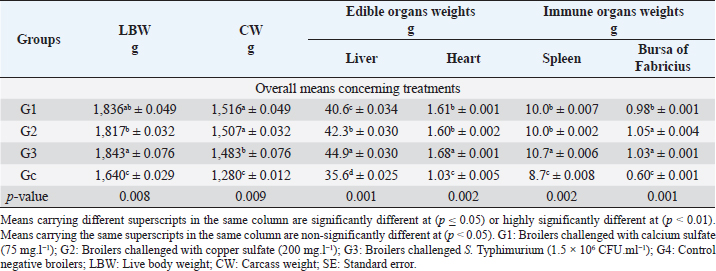 Biochemical, immunological, and hormonal profilesEichhornia crassipes 1% treated water reveals highly significant (p < 0.01, Table 4) improvements of the measured biochemical such as TP (df=3, F=60.6, and p=0.000), ALT (df=3, F=4,329.5, and p =0.000), urea (df=3, F=142.4, and p =0.000), CREAT (df=3, F=762.1, and p=0.000), GLUCO (df=3, F=1,197.9, and p=0.000), TG (df=3, F=17,063.2, and p=0.000), and TC (df=3, F=557.1, and p=0.000), and antioxidant parameters such as TAC (df=3, F=4,491.8, and p=0.000), MDA (df=3, F=1,625.8, and p=0.000), and SOD (df=3, F=640.0, and p =0.000) in all treated broiler groups compared to the control. We reported that E. crassipes 1% treated water reveals in Table 5 highly significant (p < 0.01, Table 5) increases in immunoglobulins G (df=3, F=112.5, and p=0.000) and M (df=3, F=36.3, and p=0.000) of G3 compared to the other treated groups and the control. Meanwhile, the cortisol hormone (Table 5) reveals highly significant (p < 0.01) decreases (df=3, F=358.0, and p=0.000) in all treated broiler groups compared to the control. Bacteriological assessmentsEichhornia crassipes 1% treated water in Figure 2 reveals highly significant (p < 0.01) decreases in the TBC of intestinal swabs (df=3, F=29.9, and p =0.000) and breast muscles (df=3, F=13.2, and p =0.000), TEC of intestinal swabs (df=3, F=24.0, and p=0.000) and breast muscles (df=3, F=7.6, and p=0.000), and TSC (duodenal swabs) (df=3, F=5.0, and p=0.002) in all treated broiler groups compared to the control. DiscussionWater quality in broiler farms contributes to the general conditions of production, performance, and reproduction (Maharjan et al., 2016). Broilers hold an important position among food animals, thus requiring a healthy environment and water of high quality to contribute to good health and production (Magor et al., 2013). Drinking water in broiler farms can be easily polluted/contaminated with a variety of micro-organisms through the birds themselves or the surrounding sources contributing to a potential risk to the broilers and humans (Van der et al., 2016). According to Maes et al. (2019), the arriving pollutants concerning some micro-organisms such as Stenotrophomonas maltophilia, Pseudomonas geniculata, and Pseudomonas aeruginosa contribute to a lowering in the water quality and characterization. Table 3. Live, carcass, and organ weights (Mean ± SE) in different groups supplied with E. crassipes (1 g.l-1) treated water.