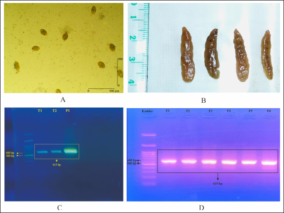 Fig. 1. Screening of F. gigantica population on ova and adult stages by duplex PCR. (A) Egg from freshly dissected gall bladder, (B) Adult F. gigantica isolated from bile ducts, (C) PCR from pooled eggs, and (D) PCR from adult F. gigantica, 8–10 adult worms per lane.