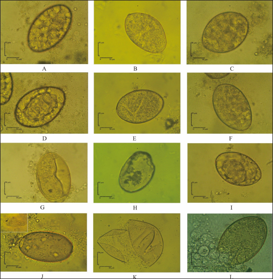 Fig. 3. Eggs development of F. gigantica showed different morphology during treatment in 5 days A–C; 9 days D–F; 11 days G–I; and 14 days J–L. F. gigantica wall destruction obviously observed during the treatment, which is showing inhibition of morulation since day 6 post treatment, followed by damage of the wall by E. elattior ethanolic extract in the highest concentration (K). Morula inside the eggs also out followed by the egg damage (L) which implied undeveloped both of undeveloped morula and egg destruction. In the untreated samples, almost all the eggs started embryo development on day 11, as observed under a light microscope (Fig. 3G). The miracidium was hatched as indicated by the larvae outside or an opened operculum (Fig. 3J). Meanwhile, Figure 3I shows the treated samples exhibited incomplete embryo development, and Figure 3H, K, and L demonstrate the destruction of egg walls. The initiation of larva development was observed in the Fluconix-340 and E. elatior-treated samples. Additionally, the destruction of egg walls was documented clearly on Fluconix-340 treated samples (Fig. 3K). Flukicidal effect of E. elatior on adult F. giganticaNo flukes were observed dead during incubation with NaCl 0.9% until 640 minutes (Table 1). In the 20% E. elatior concentration, mortalities reached 0% in 5 minutes, 0% in 10 minutes, 0% in 20 minutes, 13.33% in 40 minutes, 33.33% in 80 minutes, 100% in 160 minutes, 100% in 320 minutes, and 100% in 640 minutes as shown in Table 1. Furthermore, mortalities reached 0% in 5 minutes, 0% in 10 minutes, 0% in 20 minutes, 0% in 40 minutes, 0% in 80 minutes, 13.33% in 160 minutes, 40% in 320 minutes, and 86.67% in 640 minutes for the 10% concentration (Table 1). In the 5% concentration, mortalities reached 0% in 5 minutes, 0% in 10 minutes, 0% in 20 minutes, 0% in 40 minutes, 0% in 80 minutes, 0% in 160 minutes, 26.67% in 320 minutes, and 100% in 640 minutes as described in Table 1. For the 2.5% concentration, mortalities reached 0% in 5 minutes, 0% in 10 minutes, 0% in 20 minutes, 0% in 40 minutes, 0% in 80 minutes, 0% in 160 minutes,13.33% in 320 minutes, and 73.33% in 640 minutes as shown in Table 1. In the 1.25% concentration, no flukes were dead, as stated in Table 1. A significant flukicidal effect was observed in the incubation time of 80 minutes for the concentration of 20% (p =0.007) and 640 minutes for 10% (p =0.003). Surface and internal organs change of F. giganticaSEM of treated flukes with the concentration of 20% E. elatior showed a significantly folded ventral-sucker compared to the control as stated in Figure 4B and A, respectively. Damage to the tegument was quite prominent from the ventral and dorsal parts of the fluke (Fig. 4C and D), while the acetabulum was wrinkled and folded. Furthermore, complete erosion and loss of the spina occurred in the ventral and dorsal parts of the flukes’ body, leaving holes in the former spina position (Fig. 4C and D). In samples treated with Fluconix-340, the fluke was also wrinkled (Fig. 4E) and the spines rounded (Fig. 4F). The tegument destruction was shown by the cross-section and stained with hematoxylin-eosin illustrated in Figure 5A and D, which differ completely from negative control in Figure 5B and Fluconix-340 treated flukes in Figure 5C. The tegument of the E. elatior-treated samples was separated from the cuticle in Figure 5A, while the intestines were found to have lost their epithelium compared to the control and Fluconix-340 treated samples as presented in Figure 6C, A, and B, respectively. DiscussionThe worldwide losses in animal production due to liver fluke infection are estimated to be over 3.2 US$ billion/year. In addition, the World Health Organization declared that 180 million people are at risk of infection and 2.4 million people are infected with fasciolosis (Cwiklinski et al., 2016) with several cases occurring in all continents including temperate and tropical climates (Mehmood et al., 2017). The economic impact of the liver fluke is mainly because of antihelmintic control (Odeniran et al., 2020), condemned livers (Opio et al., 2021), and failure to achieve efficient production (Rashid et al., 2019). A previous study reported that resistance in antihelmintic, commonly used to control fasciolosis, is frequent and has continued to increase (Brennan et al., 2007; Olaechea et al., 2011; Brockwell et al., 2014). Meanwhile, the use of natural herbs to control flukes has promising potential considering that no resistance and side effects have been reported (Bauri et al., 2015). Etlingera elatior is an herb used traditionally for anthelmintic control against humans in villages of Kulawi, Central Sulawesi, Indonesia (Samarang et al., 2018). It has various active compounds which have great potential against diseases. These include tannins, flavonoids, alcohols, aldehydes, and terpenes (Chan et al., 2011). Because of its rich content, E. elatior is reportedly effective as an insecticide (Tarigan et al., 2014), anticancer (Ghasemzadeh et al., 2015), and antibacterial (Ernilasari et al., 2021). However, its anti-trematode effect against F. gigantica has not been studied. Table 1. Flukicidal efficacy of E. elatior extract to adult F. gigantica in different concentration and incubation time compared to untreated control.