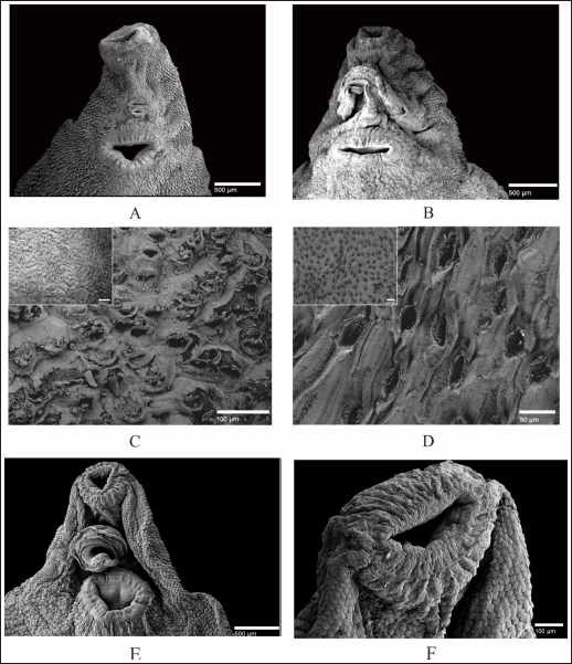 Fig. 4. SEM of F. gigantica, (A) Ventral sucker of control fluke, (B) Etlingera elatior treated samples of ventral sucker; (C) Ventral tegument; and (D) Dorsal tegument. Spines and tegument of treated samples were almost all eroded. The remaining spines were rounded (B) compared to the untreated sample with sharp-end (A). Besides, damaged skin is also erosion of the inner membrane until the tegument. € Fluconix-340 treated F. gigantica showed a wrinkled fluke and spines became rounded (F). In this study, E. elatior showed ovicidal effects against F. gigantica eggs, this is demonstrated by lethal activities on blastomeres development as shown by the incomplete formation of miracidium. On day 11, the development was significantly less with the 1.25% concentration. The results were then followed by low hatched larva on day 14, as shown by the empty-intact eggs with opened operculum. Compared to the Fluconix-340-treated sample, E. elatior showed a lower impact on the destruction of egg walls but successfully inhibited the development of larva. During the adulticidal assay, erosion of the spines was indicated by holes in the tegument surface of the flukes. Teguments showed blebs and were separated from the cuticle as demonstrated by the cross-section in the E. elatior-treated sample. The effect was completely different with Fluconix-340-treated samples, which showed shrinkage of almost all fluke tissue. The intestine of the treated sample was completely eroded leaving villi without epithelial lining in the lumen. Furthermore, Fluconix-340 showed a strong effect in vitro, as indicated by 100% mortality from the lowest concentration used, for 5 minutes of incubation time. Although both substances showed powerful effects, the E. elatior extract had a significant effect on F. gigantica compared to Fluconix-340 with different mechanisms of action which are still unknown.