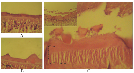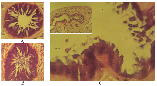 Fig. 6. (A) Hematoxylin eosin staining for the intestine of untreated-control; (B) Fluconix-340; and (C) Etlingera elatior. Intestine of F. gigantica treated with E. elatior 40% for 5 minutes showed disruption of the intestine lumen. Compared to Fluconix-340, E. elatior was less destructive in the equal concentration used but showed significant ovicidal and flukicidal effects compared to the untreated samples. Fluconix-340 contains Nitroxynil 340 mg/100 ml and its application for treating flukes has been widely reported with various concentrations in in-vitro and in-vivo studies. Furthermore, the ultrastructural changes in the tegument of flukes have long been studied as an important parameter for the determination of anthelmintic drugs and natural products’ efficacy (Abdel-Fatah et al., 2022). The tegument damage makes the parasite more vulnerable to the drug, which can percolate within the flukes, affecting several internal tissues and processes. Osmotic stress is believed to alter β tubulin molecules; hence, it may debilitate the tegument structure (Stitt and Fairweather, 1993). The weakened tegument structure also severely alters the energy-dependent NA+-K+ transport. Keiser and Morson (2008) observed internal Na+ and water content will then increase, causing swelling of the syncytium in nitroxinil treatment (Keiser and Morson, 2008). The tegumental damage may alter tegumental function in excretory and secretory via trans-tegumental uptake, disturbing signaling pathway and metabolic processes (Halton, 2004). Several herb extracts also have been studied for their anthelmintic properties. Alcoholic extract of M. oleifera green leaves showed an ovicidal effect on Fasciola non-embryonated and developed eggs with a concentration of 24.39 mg/ml (Hegazi et al., 2018). Nigella sativa and Curcuma longa also exhibited flukicidal effects by pronounced tegmental disruptions and erosion of spines in the posterior region and around the acetabulum (Ullah et al., 2017). Plant extracts of Lantana camara, Bocconia frutescens, Piper auritum, Artemisia Mexicana, Cajanus cajan (Alvarez-Mercado et al., 2015), Ocimum sanctum L. (Mahardika et al., 2017), Peganum harmala (Moazeni et al., 2017), Acacia senegal (Alsadeg et al., 2015), Zingiber officinale (Moazeni and Khademolhoseini, 2016), Cleome rutidosperma (Luis et al., 2021), Moringa oleifera (Kandil et al., 2018), Terminalia catappa L. (Anuracpreeda et al., 2017), ( Curcuma aeruginosa Roxb (Vanda et al., 2020), and Areca catechu (Yamson et al., 2019) demonstrated an in vitro anthelmintic effect against F. hepatica and F. gigantica. All the aforementioned herbs evidently have alkaloids, saponins, and tannins which handle the anthelmintic properties. Products derived from natural resources can cause lesser side effects for the host and less environmental damage. The results obtained in this in vitro assay can be considered for further in vivo study. Etlingera elatior is also suitable for feed enrichment with the expected anthelmintic effect and is highly abundant in tropical regions. This ethnopharmacological product is expected to reduce the use of chemical-based substances with side effects that might affect animals during pregnancy (El-Makawy et al., 2006). Further studies are needed on the active compounds involved, and the docking modeling for anthelmintic activities. ConclusionEtlingera elatior in this study showed a promising effect both in egg and adult stages of F. gigantica. It exhibited detrimental effects on F. gigantica tegument, reduced egg hatchability, and increased mortality in the adult stage. This is because of the extract’s high level of tannic acid, alkaloid, saponin, and flavonoid, which possess anthelmintic properties. AcknowledgmentsThe authors are grateful to Ampel abattoir staff who help during sample collection, as well as the Planning, Research, and Development Agency of Boyolali District, Indonesia, who gives permission to perform this study in the region. Conflicts of interestThe authors declare that there is no conflict of interest Author contributionsConceptualization: Penny H. Hamid. Funding acquisition: Penny H. Hamid, Muhammad Cahyadi. Investigation: Aisyah Wulandari, Andini Nurlaelasari, Wahyu Kurniawan, Herjuno Ari Nugroho. Writing: Aisyah Retno Wulandari, Penny H. Hamid, Herjuno Ari Nugroho, Muhammad Cahyadi. ReferenceAbdel-Fatah, O.R., Arafa, W.M., Wahba, A.A. and El-Dakhly, K.M. 2022. Tegumental alterations and resistance of Fasciola gigantica adult worms exposed to flukicides in Egypt. Beni-Suef. Univ. J. Basic. Appl. Sci. 11, 1–11. Ahamed, S.H., Ho, J. and Venkatesh, S.K. 2013. A fluke diagnosis. Ann. Acad. Med. Singap. 42, 368–370. Alsadeg, A.M., Koko, W.S., Osman, E., Kabbashi, A., Dahab, M. and Garbi, M. 2015. In vitro anthelminthic activity of the methanol stem bark extract of Acacia senegal against Fasciola gigantica. Inter. Inven. J. Biochem. Bioinform. 3, 18–22. Alvarez-Mercado, J.M., Ibarra-Velarde, F., Alonso-Díaz, M.Á., Vera-Montenegro, Y., Avila-Acevedo, J.G. and García-Bores, A.M. 2015. In vitro antihelmintic effect of fifteen tropical plant extracts on excysted flukes of Fasciola hepatica. BMC. Vet. Res. 11, 1–6. Alvarez-Sanchez, M.A., Mainar-Jaime, R.C., Perez-Garcia, J. and Rojo-Vazquez, F.A. 2006. Resistance of Fasciola hepatica to triclabendazole and albendazole in sheep in Spain. Vet. Rec. 159, 424–425. Anuracpreeda, P., Chawengkirttikul, R., Ngamniyom, A., Panyarachun, B., Puttarak, P., Koedrith, P. and Intaratat, N. 2017. The in vitro anthelmintic activity of the ethanol leaf extracts of Terminalia catappa L. on Fasciola gigantica. Parasitology 144, 1931–1942. Arafa, W.M., Shokeir, K.M. and Khateib, A.M. 2015. Comparing an in vivo egg reduction test and in vitro egg hatching assay for different anthelmintics against Fasciola species, in cattle. Vet. Parasitol. 214, 152–158. Arjona, R.R., Aguado, J.M., Salesa, R. and González-Macías, J. 1995. Fascioliasis in developed coun