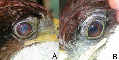 Cataracts are caused by the opacity of the lens and can occur in many species, including birds (Keymer, 1977; Williams, 2008). Causes of cataracts in birds can be congenital, secondary to trauma, electrical injury, nutritional deficiencies, infectious, neoplasia, genetics, aging, and other ocular problems such as uveitis and retinal degeneration (Keller, 1992; Bayon et al., 2007; Dees and MacLaren, 2012). Inherited cataract has been described in canaries (Bayon et al., 2007). In free-living raptors, cataracts frequently occur due to trauma (Murphy et al., 1982; Buyukmihci et al., 1988).