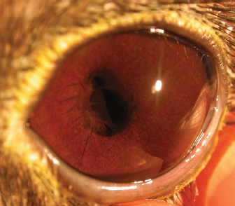 The general physical examination was normal. The visual examination revealed that the bird showed blindness, determined by negative menace and absence of visual tracking response. The dazzle reflex was positive OU. The direct pupillary light reflex was brisk and completed OU. Consensual pupillary light reflex was not carried out due to complete optic nerve fiber decussation at the optic chiasm in birds (Kern et al., 1984; Bayon et al., 2007). Ocular examination was carried out using a slit-lamp biomicroscope (SL-15 portable slit lamp, Kowa Company, Ltd., Nagoya, Japan). The cornea, anterior chamber, and iris were normal. A hypermature cataract was observed OU (Fig. 1). The fundus could not be assessed due to the substantial opacity of the lenses. A clinical diagnosis of cataract OU was made based on the appearance of bilateral opacity of the lenses obstructing photo-translumination to the fundus. No other eye problem, such as lens-induced uveitis, was detected.