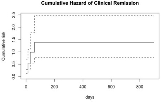 Fig. 2. Cumulative Hazard Curve showing that clinical remission was reached in all dogs at the beginning of monitoring (maximum 120 days) and was maintained throughout the study. Digoxinemia serial monitoring showed only slight fluctuations in the first-year monitoring. Differently, unexpected spikes in digoxinemia were recorded in three dogs (C2, C4, and C5) after 1 year monitoring despite treatment posology remained constant. Since only mild weight variations were registered in dogs during the monitoring, it is difficult to attribute the increase of digoxinemia to weight changes. Furthermore, the haemato-biochemical parameters did not show significative alterations to consider the altered metabolism of digoxin due to organ failure as the cause of the abnormal increase in serum digoxin. In fact, the elimination of digoxin is mainly by renal clearance, transport by P-glycoprotein also contributes to elimination. Consequently, a higher serum digoxin concentration for a given dose occurs in patients with renal impairment, weight loss and in those taking drugs (amiodarone, verapamil, macrolides, azole antifungals, and cyclosporin), which inhibit P-glycoprotein transport, which is not the case of our dogs. Other conditions could increase sensitivity to digoxin including electrolytic and acid-base disturbances, myocardial ischemia and hypoxemia (Pincus, 2016). The spikes in digoxinemia registered in dogs in this study were apparently unwarranted. The reasons inducing the spikes remain unknown and need further investigation. In fact, the post hoc statistical analysis results showed no influence of all the studied clinical and haemato-biochemical variables on the risk to develop spikes in digoxinemia during a long-term follow up, except for the ECG HR. It could be argued that dogs having a stronger HR reduction trend in the first-year monitoring had a less severe progression of the underling structural disease influencing the HR response and reducing hypoxemia. Further studies need to address the point.