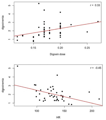 Fig. 3. Linear regression correlation curve showing the mild positive correlation between digoxin dose and digoxinemia (r=0.33) and the negative correlation between the ECG HR and digoxinemia (r=−0.45) on the whole data collected throughout the study. Curves using obtained and calculated ECG HR were overlapping. In two dogs (C2 and C4), spikes of digoxinemia (>4 ng/ml) were associated with bradyarrhythmia (HR 40 bpm in C2 and 65 bpm in C4) and with signs of systemic disease (weakness, depression and dysorexia). These signs and HR reverse to normal with the temporary suspension of therapy and following dose reduction. It is known that the mean elimination half-life in dogs is 73 hours; therefore, if digoxin toxicity is suspected, digoxin should be discontinued for several days, and then restarted at a lower dose (Kuhlmann et al., 1979). In our study, after the first year of treatment we scheduled follow ups twice a year. Based on our data, it could be suggested that monitoring of digoxinemia need to be scheduled more frequently to prevent intoxication. Signs of intoxication could be underestimated by the owner because often vague, non-specific and misinterpreted as a progression of underlying cardiac disease. In the retrospective study, all dogs diagnosed with AF had underlying heart disease with a prevalence of 64% of subjects affected by DCM, 18% by MMVD, and 18% by congenital pathologies, accordingly to the prevalence previously reported (Pedro et al., 2018; Ward et al., 2019). DCM and MMVD are known to be the most frequently structural disease associated with AF (Bonagura, 1986; Guglielmini et al., 2000; Van den Berg et al., 2002; Menaut et al., 2005; Pedro et al., 2018; Guglielmini et al., 2020). All dogs, except for one, were symptomatic due to AF at the time of diagnosis. Ascites was a constant clinical sign, sometimes associated with other cavity effusions and weakness. The development of signs of right CHF in dogs with AF and left-sided structural heart diseases (MMVD and DCM) is explained by the fact that AF causes an acute increase in pressure in the right atrium that is hemodynamically more significant than the increase in pressure in an already dilated left atrium (Ward et al., 2019). It is interesting to note that only six dogs out of 16 with ascites had right side remodeling at echocardiography (i.e., eccentric hypertrophy, right atrium dilation). The reversal of AF clinical signs occurred in 88.2% of dogs (15/17) and was achieved within a maximum of 4 months from therapy starting (with an average of about 2 months), regardless the initial digoxin dosage, digoxinemia and HR. The remission of clinical signs resulted independent from HR registered at ECG at time of remission. Anyway, it could be possible that HR was influenced by the emotional status of the dog in an ambulatory setting, or the chosen statistical method may not have enough power to capture the correlation of HR to clinical remission (Gelzer et al., 2015; Pariaut, 2017). The possible effect of concurrent treatments on HR reduction and clinical improvement needs also to be considered in this study, particularly in dogs with AF secondary to decompensated cardiac diseases. In fact, drugs employed for treatment of CHF can have a positive effect in reducing high ventricular rate in dogs with concurrent AF. In general, from the evaluation of HRs data throughout the study, clinical HRs differ from ECG HR values; while ECG calculated and obtained HR values were quite overlapping. Cardiac auscultation is recognized inaccurate for HR estimation in dogs with AF (Glaus et al., 2003). The method of evaluation through the 1-to-5-minute ECG in clinical practice is a reliable method but tends to overestimate the HR for increased sympathetic stimulus. Holter remains the recommended method, but it is not always practicable and can be expensive. From the whole data set analysis, digoxin serum concentration resulted only mildly correlated to the digoxin dosage probably because of the individual response as already known and negatively correlated with ECG HR, indicating that the negative chronotropic effect of the digoxin drug is influenced by the serum concentration (Teske et al., 1976; Nagashima et al., 2001). Although the superiority of the association of digoxin with diltiazem has been suggested to more effectively slow HR even during exercise, excitement, and stress, in the prospective study, digoxin monotherapy was chosen under the owner authorization to avoid the influence of other variables on digoxinemia (Gelzer et al., 2009; Jung et al., 2016; Pariaut, 2017). In the retrospective study dogs have been treated in monotherapy mostly under owner concerns to give further drugs. Results of this study show that AF signs can be controlled with digoxin alone. When owner compliance is improved by limiting the number of cardiac medications prescribed to his pet, AF treatment in monotherapy is a good option to suggest. Limitations of this study include, among the others, the small dog population both in the retrospective and in the prospective study (particularly for a post hoc analysis), the HR evaluation by ECG and not by Holter which represent the gold standard, the concomitant administration of other cardiologic drugs to control the underlying disease that could have influenced some data. ConclusionResults of this study suggest that digoxin in monotherapy still remain a good option to treat AF in dogs since signs associated with AF can be controlled and reversed. Anyway, due to its narrow therapeutic index and toxicity, digoxin should be used carefully. In this study, the importance of long-term monitoring is emphasized since digoxin toxicity could emerge during long-term therapy similarly to what happen in human medicine. Long-term monitoring of digoxin serum concentration can reveal increases that require suspension or reduction of dosage to avoid dangerous and toxic effects, especially after one year treatment. It should be 