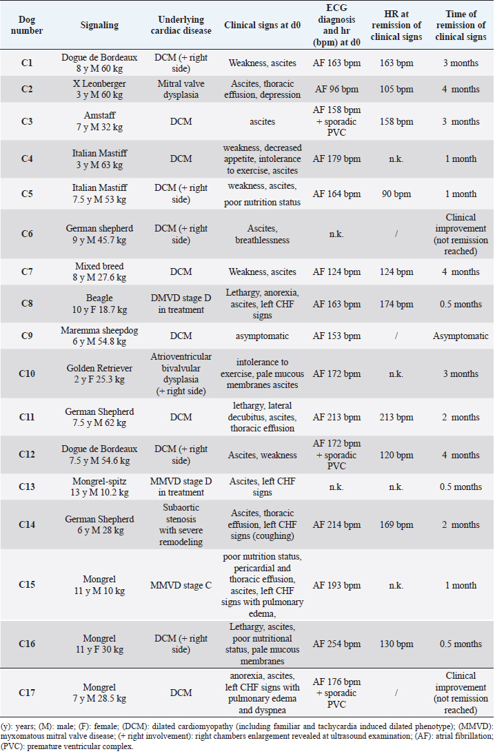 AbstractBackground: Atrial fibrillation (AF) is the most common arrhythmia in dogs, most frequently diagnosed as chronic AF associated with a structural heart disease. The therapeutic strategy, in these cases, is based on the heart rate control and digoxin is one of the most used drugs. Aim: The aim of this work was to study the serum digoxin concentration changes in dogs with AF under long-term treatment with digoxin. Furthermore, the remission of clinical signs and the correlation between digoxinemia and other clinical and laboratory variables were retrospectively evaluated. Methods: The prospective study was conducted on seven large breed dogs from the time of reaching the definitive digoxin dosage. Digoxinemia was determined at month: 1, 3, 6, 9, 12, then twice a year. A post hoc statistical analysis investigated the influence of selected clinical and laboratory variables on the risk to develop spikes in digoxinemia. Clinical data, heart rate, digoxin dosage (mg/m2), and digoxinemia (ng/ml) at all available follow-ups were retrospectively evaluated from the medical records of 17 further dogs and a linear regression analysis was performed on the whole data set. The relation between the time of remission of AF clinical signs and variables was also investigated. Results: An unexpected increase in digoxin serum concentration was recorded in three dogs after one year monitoring, in absence of digoxin dosage changes. No statistical significance of all the studied variables on the risk to develop spikes of digoxinemia was registered. Two dogs, reaching digoxinemia 4.46 and 5.24 ng/ml, showed symptoms that reversed after digoxin withdrawal. From retrospective data, 88% of dogs reached complete reverse of AF clinical signs in 2.1 months from digoxin treatment starting, regardless of digoxin initial dosage, digoxinemia, and heart rate. Conclusion: Digoxin in monotherapy remain a good option to treat AF in dogs, anyway digoxin toxicity could emerge during long-term therapy, similarly to what happen in human medicine. Life-threatening spikes of digoxinemia could occur, especially after 1-year treatment with digoxin. It is very important that practitioners be aware of this possibility and encourage the owners to monitor digoxinemia during long-term treatment to avoid dangerous and toxic effects. Keywords: Atrial fibrillation, Digoxin, Digoxin serum concentration, Dogs. IntroductionAtrial fibrillation (AF) is the most common arrhythmia in dogs with a recently reported incidence of 33.7% of all arrhythmias found on electrocardiographic examination (ECG) (Noszczyk-Nowak et al., 2017). It is related to a high mortality rate if left untreated (Bonagura, 1986; Stokhof and van den Brom, 1990; Jung et al., 2016; Pedro et al., 2018). This arrhythmia is characterized by a rapid, chaotic and disorganized atrial electrical activity, which results in the loss of an effective contraction of the atria, functional to ventricular diastolic filling, and high ventricular rate (Pedro et al., 2020a). The main hemodynamic consequences are a reduction in cardiac output and increased atrial filling pressures with the development or worsening of clinical signs of congestive heart failure (CHF) (Saunders et al., 2009). AF is most frequently diagnosed in association with underlying structural heart diseases, and it is often associated with CHF (Pariaut, 2017; Ward et al., 2019). Atrial enlargement, fibrous remodeling, elevated adrenergic tone, and activation of the renin–angiotensin–aldosterone system represent irreversible changes that promote the onset and maintenance of AF (Pariaut, 2017). Once established, AF contributes to further deterioration of cardiac function mainly due to the rapid and irregular ventricular response rate (VRR) which is the result of high adrenergic tone associated with a reduced ability of the atrioventricular node to block atrial impulses (Pariaut, 2017). In canine clinical practice, AF is a well-known and frequent arrhythmia. Scientific papers on dogs have been recently published documenting and discussing the association between AF and clinical signs of right CHF, the association between a post-treatment low heart rate (HR) and a longer survival time (Pedro et al., 2018; Ward et al., 2019). The role of AF as a prognostic factor in dogs with myxomatous mitral valve disease (MMVD) and dilated cardiomyopathy (DCM) in Dobermans has been investigated (Friederich et al., 2020; Guglielmini et al., 2020). Up until now, the primary therapeutic aim to treat AF in veterinary medicine is the maximization of cardiac output through two treatment strategies: the HR control or the conversion of AF to sinus rhythm (Saunders et al., 2009; Pariaut, 2017; Pedro et al., 2020a,b). The latter is reserved for a few cases (i.e., idiopathic AF), while in most cases (chronic AF associated with structural heart disease) the treatment strategy involves the use of drugs aimed to decrease VRR. Digoxin alone or in combination with other medications is one of the most commonly used drug to treat AF in dogs (Pariaut, 2017). However, prospective clinical trials including long-term safety of digoxin are missing as reported in a recent review from Pedro and collaborators (2020b). It is known from human medicine that digoxin toxicity emerges mostly during long-term therapy and that clinical features of toxicity are often nonspecific with lethargy, gastrointestinal signs, neurological symptoms, or arrhythmias that could be fatal (Tatlisu et al., 2015; Pincus, 2016). The purpose of the present work was to study the changes of serum digoxin concentration in dogs with DCM and AF under long-term treatment with digoxin. Furthermore, data from other dogs under digoxin treatment were retrospectively studied to evaluate the reversal of clinical signs and the correlations of digoxinemia with clinical, laboratory and instrumental variables. Materials and MethodsProspective studyIn dogs with a diagnosis of chronic AF, having the owners