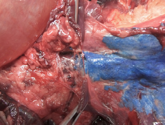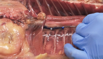 Fig. 1. Polyurethane foam injection at the level of the left caudal TPVS in a cat cadaver. The Tuohy needle has been used to probe the space, avoiding any damage to the parietal pleura (asterisk). The tip of the needle in at the level of the thirteenth left costovertebral joint. Statistical methodsData analysis was performed using GraphPad Prism Version 8.0.1 (GraphPad Prism Software, Inc., La Jolla, CA). Pearson correlation coefficients were calculated for the amount (ml kg−1) of injectate solution (ioversol and NMB) and ipsilateral cranial, ipsilateral total (measured on radiography and necroscopy), and bilateral total spread, expressed as the number of stained proximal intercostal spaces. Agreement between the radiographic and the necroscopic assessment of the dye spread was analyzed using the Bland–Altman method (Bland and Altman, 1995, 2003, 2010). Results are expressed as median (range).