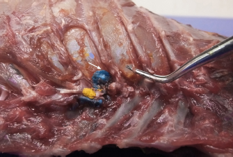 Fig. 7. NMB and ioversol longitudinal ipsilateral thoracic paravertebral spread in a dog cadaver. Ventral view.