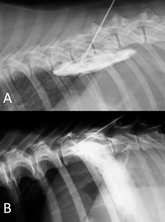 Fig. 10. NMB and ioversol mixed longitudinal and cloud-like (A) and intercostal (B) spread pattern in a lateral radiograph of a cat cadaver.