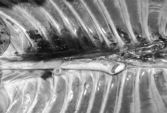 Fig. 11. NMB and ioversol longitudinal bilateral thoracic paravertebral spread in a cat cadaver. Ventral view.