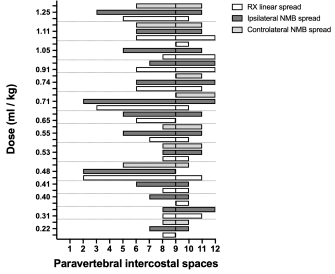 Fig. 9. Staining and contrast distribution following increasing doses of 1:1 mixture of NMB and ioversol injected in single shot at the level of the ninth intercostal space in dog cadavers. The solid line at the level of the ninth paravertebral intercostal space represents the injection site. DiscussionTo our knowledge, this is the first study investigating the cranial and caudal limits of TPVB in dog and cat cadavers. For this purpose, we used polyurethane foam because of its advantages over liquid dyes and resins: by virtue of its chemical and physical properties, the foam spreads easily within anatomical cavities and naturally communicating anatomical spaces, without damaging anatomical structures or staining surrounding tissues (De Sordi et al., 2014). The foam spread to the brachial plexus and the retroperitoneal space, demonstrating ways of anatomical communication that are of interest for investigating new approaches to brachial plexus and thoraco-lumbar paravertebral blocks in dogs and cats. The caudal limit of the TPVS has been a debated topic because of inconsistent study results. Some studies identified the origin of the psoas major muscle as the caudal boundary of the TPVS (Lönnqvist and Hildingsson, 1992), whereas others claimed observation of lumbar spread of medium injected in the caudal portion of the space in humans, rabbits, and dogs (Conacher and Kokri, 1987; Saito et al., 2002; Serra et al., 2019), which is probably explained by anatomical communication between the endothoracic and the transversalis fascia, the basis of the “extended unilateral anesthesia” (Saito et al., 1999). This anatomical feature underlies the rationale for the use of TPVB in inferior abdominal surgery in humans (Fusco et al., 2016). Interestingly, our findings disclosed a similar communication between the thoracic and the caudal lumbar PVS in the dog and the cat cadavers, although abdominal retroperitoneal spread was not consistent across all subjects. In our opinion, reaching the lumbar paravertebral spaces with a single caudal thoracic injection could be useful in invasive unilateral surgeries such as radical mastectomy or oncological surgery of the caudal thoracic wall or the flank region. The cranial spread limit observed at the level of the third – fifth cervical vertebra in the dog and the cat cadavers is in line with the human literature (Karmakar, 2001), although the cranial boundary of the TPVS in humans is still poorly described. The present study confirms what is already known (Portela et al., 2012, 2017; Serra et al., 2019) about the anatomical contiguity between the TPVS and the prevertebral, mediastinal, and intercostal space. Not having investigated the staining of the epidural space can be considered one of the major limitations of this study.