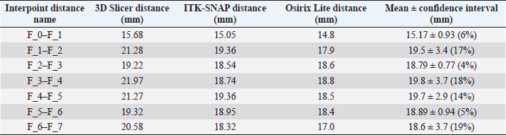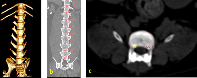 Fig. 3. (a) Vertebra length determination in Osirix Lite. (b) Vertebra length determination in 3D Slicer. (c) Vertebra-loading surface area determination.