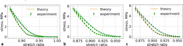 where t is the independent parameter time, and aik and dik are material constants for each load/unload cycle k. The approximation of cyclic curves was performed by second steps. We began by compressing the vertebrae using cyclic loads. We obtained hysteresis loops after compressing the vertebrae 10 times. These obtained cycles are shown in Figure 4. Following that, we determined the minimum and maximum values by analyzing the hysteresis loops. Then, the extreme values of stress and stretch versus time relationships were found. These extreme values were used to determine each compression–relaxation cycle, because each cycle is unique and should be approximated separately (Fig. 5a, b). After that, time indexes of extreme values of obtained stress and stretch array values were approximated by seventh- and second-order polynomials, accordingly. Numerical optimization was applied using the SciPy optimize curve_fit function (Virtanen et al., 2020), and polynomial coefficients were found. All these graphs (Figs. 6–8) were created using a seventh-order polynomial. It is believed that, in living organisms, the hysteresis loop is different due to the compensatory and decompensatory mechanisms involved. Normalization was performed to compare the same mechanical properties of different vertebrae.