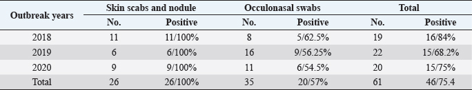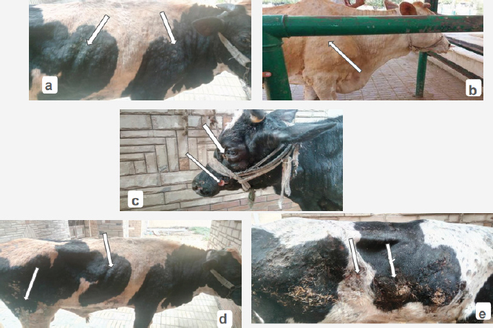 Fig. 1. Cattle with characteristic of LSDV. (a and b) Generalized circumscribed active nodules covering entire body; (c) nodules on head with lacrimation; and (d and e) progression of the disease with the observation of eroded and crusted nodules and scab formation. Table 2. The data of collected LSD samples either nodules or oculonasal swabs during three outbreaks (2018, 2019, and 2020) from cattle by conventional PCR with demarcation of the incidence.