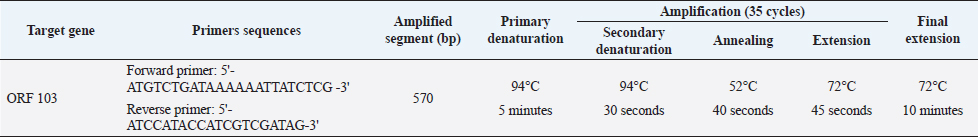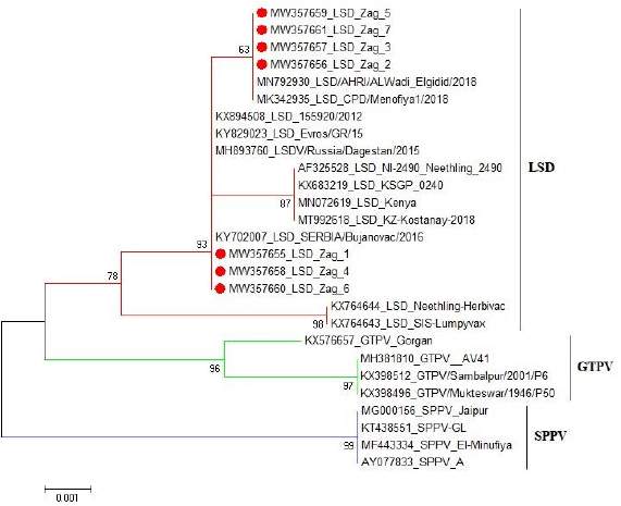 AbstractBackground: Lumpy skin disease (LSD) is endemic in Egypt despite the Egyptian authorities’ annual mass vaccination of cattle with sheeppox vaccine (Veterinary Serum and Vaccine Research Institute, Egypt), and the LSD virus (LSDV) continues to thrive practically every summer. The disease has a huge economic impact on the trade of the animal and its by-product. Aim: This paper study the molecular characterization of LSDV strains that have been circulating in Sharkia Governorate, Egypt, for three successive years (2018, 2019, and 2020). Methods: A total of 61 specimens (26 skin nodules and 35 oculonasal swabs) were collected from a clinic in the hospital of veterinary medicine, Zagazig University, during the summer months (July, August, and September) of three outbreaks in 2018, 2019, and 2020. These were examined by polymerase chain reaction (PCR) based on the open reading frame 103 (ORF103) gene to confirm the suspected cases and determine the degree of homology between the three different outbreaks during three successive years between each other and between the derived sequences of GenBank. Results: Cattle is thought to be infected with LSDV due to the presence of scattered local or diffuse circumscribed skin nodules along with fever and lymph node enlargement and sometimes leg edema. The PCR approach proved rapid, sensitive, and specific for the detection of LSDV and confirmative diagnosis of the disease. Forty-six were detected to be positive by PCR (75.4%). The seven sequenced samples were translated to amino acid and registered in GenBank under accession number MW357655-MW357661. A single nucleotide mutation and amino acid variation were observed at positions 161 C (2020)/T (2018&2019) and consequently, a change in the amino acid at position 54 P (2020)/L (2018&2019) between the outbreak in 2020 and those in 2018 and 2019, respectively. The field LSDV isolates from Egypt cattle were more closely related to other LSDV sequences from Africa (Kenya), Asia, Europe, and the United States. These findings highlight the necessity of ongoing surveillance and characterization of circulating strains and the need to improve procedures for distinguishing vaccine strains from field viruses. Keywords: Lumpy skin disease, Egypt, Cattle, Phylogenetic analysis, PCR. IntroductionLumpy skin disease virus (LSDV) is a double-stranded DNA virus that encodes 30 structural and nonstructural homologs of pox viral proteins. It is closely genetically and antigenically related to Sheeppox virus (SPPV) and Goatpox virus (GTPV) (Tulman et al., 2001, 2002), which belongs to the genus Capripoxvirus (CaPV), subfamily Chordopoxvirinae, and family Poxviridae that can infect a wide variety of animals especially cattle, buffalo and wild ruminant (Sharawi and Abd El-Rahim, 2011). Due to its potential rapid spread and economic impact, the World Organization for Animal Health (OIE) has designated LSD as a notifiable disease (Shen et al., 2011). The transmission of the LSDV mainly occurs mechanically via insect vectors, including mosquites as Aedes species especially female Aedes aegypti (Chihota et al., 2001) and by ticks (Tuppurainen et al., 2011), also Hodhod et al. (2020) detected the virus by polymerase chain reaction (PCR) from collected tick samples. However, there are also minor routes of transmission that need to take into consideration, such as direct contact with an infected animal through the mucosa and indirect contact by sharing the same food and water troughs (Mikhael et al., 2017). Therefore, the restriction of the movement of cattle along with vaccination and the control of insect vector may be considered as the good procedure that limit occurrence of new outbreaks of LSD in near future (Sharawi and Abd El-Rahim, 2011; Aleksandr et al., 2020). LSDV infection is clinically manifested by fever, circumscribed nodules (2–5 cm in diameter) on the skin and mucous membranes with deep eroded and crusted lesions, and enlargement of superficial lymph nodes. In severe clinically diseased animal lesions may extend to the respiratory and gastrointestinal tracts, emaciation, and sometimes death (Carn and Kitching, 1995; Gari et al., 2011; Constable et al., 2017; Abdallah et al., 2018). Animals that recover from this severe disease may experience mastitis, pneumonia, and the formation of necrotic skin plugs leaving deep holes in the hide (Tuppurainen et al., 2017). LSDV is worldwide distribution. In Egypt, it was first recorded between 1988 and 1989 and again in 2006, 2011, and 2014 (Salib and Osman, 2011; Elhaig et al., 2017). In addition, the disease reemerged during the summer of 2016 and 2018 even in animals vaccinated with the Romanian SPPV vaccine (Elhaig et al., 2017; Allam et al., 2020). LSDV continues to be noted in Egypt every summer as recorded by Keshta et al. (2020) and Rouby et al. (2021). LSDV infection leads to financial-economic losses in affected countries due to the restrictions on applied trade of diseased animals and its products (Tuppurainen et al., 2017), temporary or permanent loss in milk production and condition, infertility, abortion, and permanently damaged of hides (Irons et al., 2005; Salib and Osman, 2011). Further economic loss is due to restrictions in animal movement, vaccination costs, and costs of treating secondary bacterial infections (Molla et al., 2017). In different circumstances, the morbidity of LSD ranges from 3% to 85%, whereas the mortality rate fluctuates between 1% and 40% depending on the nature of the disease, either endemic or not (Coetzer and Tustin, 2004; Constable et al., 2017). The wide ranges of morbidity and mortality are due to genetic diversity in livestock breeds leading to a variable degree of susceptibility to disease, virulence of the isolated virus, and a wide range of transmission routes (Tuppurainen et al., 2017). Furthermore, LSDV can survive for a further 120 days in infected tissue and the usage of quarantine regulations is limited (Awadin et