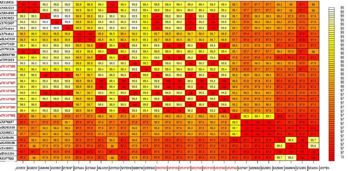 Fig. 4. The pairwise heatmap shows the distance matrix between each pair of isolates to determine degree of similarity and diversity relationship among selected CaPVs sequences. The heatmap was generated using R software (package: plot.matrix). The PCR assay detected LSDV in 26 (100%) of 26 skin nodules from the corresponding infected cattle. The PCR result was fully correlated with the field diagnosis based on clinical symptoms. Although, the presences of several other sources for virus detection, such as oral, nasal, and ocular discharges, were determined, scabs and nodules are classified as the best sample materials as they are easy to collect without the use of local anesthesia and can withstand long transport in different temperatures with more concentration of viral particles than other origins (Tuppurainen et al., 2005; El-Kholy et al., 2008). While the PCR assay detected LSDV in 20 (75%) of 35 oculonasal swabs from the corresponding infected cattle, this was attributed to intermittent virus discharge in the nasal and ocular discharges during infection with LSDV, which started on day 11 post-infection (pi) and was thought to persist until day 38 pi (Aleksandr et al., 2020). In this study, the PCR assay showed high specificity as a unique band of the expected size (approximately 570 bp) was obtained for the ORF103 gene of all positive DNA samples derived from skin scabs and nodule samples and oculonasal swabs. LSDV is closely related to other CaPVs; however, it has a unique complement of genes responsible for viral host range and virulence, according to genomic comparison (Sharawi and Abd El-Rahim, 2011). These results were consistent with the findings of El-Nahas et al. (2011); Sharawi and Abd El-Rahim (2011); and El-Khabaz (2014). This indicates that there was less nucleotide exchange through the years between the outbreaks. This finding is correlated with the known fact that CaPVs are highly conserved within and among their species (Tulman et al., 2002; Babiuk et al., 2008). Direct sequencing of PCR amplicons and comparative genetic analyses were useful to not only trace the new outbreak LSDV but also establish genetic tools for epidemiological studies and the development of novel efficient LSDV vaccines (El-Kholy et al., 2008; Varshovi et al., 2009). To prevent the introduction of LSDV from neighboring countries during importation, it is strongly recommended to apply the PCR assay in examination of live domestic and wild bovine species and bovine semen from endemic countries at quarantines (El-Kholy et al., 2008; Tuppurainen et al., 2017). Molecular analysis indicated that there was no significant nucleotide variation among the current and previous field isolates included in this study, except a single nucleotide mutation and a single amino acid variation. On the other hand, a sequence difference was observed between the vaccine strain and the field isolates. The phylogenetic analysis of the ORF103 gene sequences was able to group the CaPVs into three distinct groups: LSDV, SPPV, and GTPV. It further showed that LSDVs from the outbreaks in Sharkia, Egypt, grouped with LSDV isolates from Kenya, Belgium, Serbia, Russia, Kazakhstan, and Greece (Fig. 3 and Table 3). These sequences were closely related to the sequences from Kenya when compared according to nucleotide identity, therefore suggesting that the same LSDVs are responsible for outbreaks across borders. The BLAST analysis revealed high sequence homology of 98.6%–100% between the LSDV sequences and sequences in GenBank, while the sequence corresponding to the outbreak in 2020 showed an identity of 100% with the LSD sequences from Israel in 2012 (KX894508), Greece in 2015 (KY829023), and Serbia/Bujanovac in 2016 (KY702007). Moreover, the sequence samples corresponding to the outbreaks in 2018 and 2019 showed complete identity between two outbreaks and 100% identity with the outbreak in 2018 in ALWadi Elgidid and Menofiya, Egypt, while the identity between these two outbreaks and the outbreak in 2020 was 99.82%. From the previous analysis, no new virus circulated among different breeds of cattle in different countries of Egypt. This may be due to the small number of LSDV sequences used in this assay with the use of only a single gene and only one governorate and the highly genetic stability of LSDV (Mafirakureva et al., 2017; Ochwo et al., 2020). The variation between the wild-type LSDV and sequence corresponding to SPPV either wild or virus may be interpreted as the need for further diagnostic testing, along with the sequencing of several LSDV genes, and must be performed along with the sequence of the Romanian strain of SPPV used as a vaccine by the Egyptian authorities.