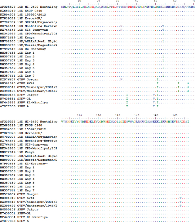 Similarly, the deduced amino acid sequences of the ORF103 gene of the isolates of the outbreak in 2020 and those in 2018 and 2019 revealed a single amino acid variation proline by leucine (P/L) at residue position 54 (Fig. 5). The protein (AA) differed from isolated strains from other LSD sequences in GenBank by substituting only 1 or 2 AA at position 54 substituted P by L (only isolates of 2018 and 2019) and 71 position substituted G by S (recorded this change on all field isolates). Whereas, vaccine strains of LSD either LSD Neethling-Herbivac or LSDsis–lumpyvax substitute 32 T by N when compared with all isolates either field isolates or those derived from GenBank. When compared with goatpox, 3 or 5 amino acids were substituted, while sheeppox was substituted by 4 AAs as illustrated in Fig. 5. The putative virion core protein was the most abundant protein found in the sequence. DiscussionLSD is endemic in several African countries, rapidly spreading throughout the Middle East, including Egypt. A prolonged debilitating clinical course, reduced weight gain, permanent damage to hides, temporary or permanent infertility or even sterility in bulls, temporary or permanent loss of milk production, and abortion of pregnant cattle have all been identified as important cattle health problems (Leliso et al., 2021).
