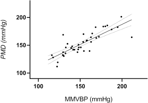 Fig. 1. Correlation between the MMVBP device and the PMD device for SBP assessment in 40 conscious dogs (r=0.8269; p < 0.0001). The solid line represents the coefficients of correlation; the dashed lines represent the 95% confidence intervals. MMVBP, Mano Médical Vet BP; PMD, Parks Medical Doppler; SBP, systemic blood pressure. DiscussionThe assessment of SBP in conscious veterinary patients is commonly achieved by noninvasive indirect methods. The PMD, for instance, is one of the most commonly used Doppler ultrasonography devices in veterinary practices across the world and is considered to be a reliable tool for the acquisition of SBP measurements in conscious dogs (Acierno et al., 2018). Its recent discontinuation from the market has prompted the need for replacement devices to be considered; however, data regarding the agreement between different Doppler devices is currently limited. The aims of the present study were to compare two Doppler devices, the PMD and the MMVBP, for the measurement of SBP in conscious dogs in the clinical setting. In this study, SBP analysis was performed in a total of 40 conscious dogs, and the mean SBP readings provided by the two Doppler devices were not statistically different. The correlation between devices was observed to be very good, reflecting that a change in SBP detected by the MMVBP likely reflects an identical change with the PMD device (Hinkle et al., 2003). Agreement between devices was assessed using a Bland–Altman plot, which indicated that the MMVBP tended to slightly underestimate SBP compared to the PMD. According to this plot, the mean difference (bias) for SBP between devices was not large, but the SD was, which consequently led to a wide LoA. The mean of the values acquired with both devices differed from each other by < 10 and 20 mmHg in 70% and 93% of dogs, respectively. As observed in Figure 2, in one dog, this difference was greater than 40 mmHg. Based on this study’s results, the authors believe the disparities observed between devices were likely attributable to intraindividual variability in SBP over time. As previously shown in both canine and feline patients, blood pressure can significantly change overtime with repeated measurements (Remillard et al., 1991; Sparkes et al., 1999). The sets of SBP measurements were obtained consecutively not simultaneously, therefore a degree of minute-to-minute variation in blood pressure is likely to have occurred. The average time for acquisition of a SBP reading usually ranges between 15 and 25 seconds; however, in some cases, this can take longer (Haberman et al., 2006). During this time, the handling of the patient could result in sudden elevations in SBP and consequently lead to an increased variability between measurements. Unfortunately, this situational hypertension (previously termed “white-coat” effect) can be difficult to completely eliminate even when an attempt is made to select amenable dogs (Marino et al., 2011; Acierno et al., 2018). The underestimation of SBP by the MMVBP may also have been influenced by the order in which the devices were used (the PMD device was always used first) as the dogs could have become acclimatized to the technique by the time the MMVBP was used. Retrospectively, it would have been better if the order the devices used was randomized.