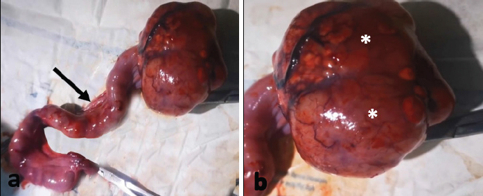 Fig. 1. Gross appearance of the uterus and the right ovarian GCT in a 5- year-old Persian cat. (a) The uterus appears thickened and convoluted with cork screw appearance (arrow). (b) The right ovary shows an attached ovarian cystic tissue mass which is a rounded in shape with multilobulation and intact capsule (asterisks).