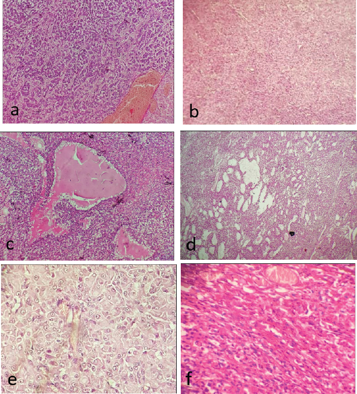 Fig. 2. Various histopathological patterns of ovarian GCT in a 5-year-old Persian cat. (a) Microfollicular growth pattern. (b) Tumor cells are arranged in small nests. (c) Acinar formation. (d) Alveolar like growth pattern. (e) Sertoli cell like growth pattern. (f): Spindle cells arranged in tight fascicles. (H&E stain; a– f: 100×; d: 40×). The endometrium examination revealed thickened endometrial lining with elongated glands and prominent stroma. There was also a dilatation of glands with formation of variable sized cysts (Fig. 4). No cytological atypia was seen, nor evidence of complexity or tumor deposits or invasion. The contralateral ovary and fallopian tube showed normal histological findings, with no evidence of malignant infiltrations.