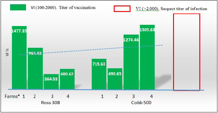 Fig. 2. VI of 1-day-old Ross 308 AND Cobb 500 broiler chicks. (*) Farms: (1): Tal-Afar; (2): Kokgaley; (3): Al-hamadania; (4): Al-quba. This is may be due to the difference in the strain genotypes of Ross breed in comparison with Cobb 500 breeds or due to massive selection to disease resistance breeding by the primary breeders, these genes are carried on major histocompatibility complex genes class IV region responsible for the difference in immune response between chicken breeds. This agrees with Lwelamira et al. (2009) who explain that the production of antibodies in the humoral immune response is controlled by many genes responsible for genetic resistance. Both hybrids Cobb 500 and Ross 308 are excellent to keep by following the housing and feeding requirements (Strakova et al., 2015). They achieve weights of 2 kg and above in 42 days, but the superior genetics of Cobb 500 give an extra edge to this hybrid breed, since, Cobb 500 has better average daily weight gains and growth performance (El-Tahawy et al., 2017; Pascalau et al., 2017) and better immune defense system to counter diseases than Ross 308 (Mayahi et al., 2016; Gholami et al., 2020). Immune responses are crucial for optimal health and affected by host genetics. Some genes in broiler chickens regulate disease resistance (Mansour et al., 2016). Monitoring of vaccination responses in poultry is the mean corner stone for the successful vaccination programs by estimating the mean titer of antibodies in a given flock and their measurement of uniformity using for example ELISA technology (Hamal et al., 2006; BioChek, 2012). Our current results further supported by the study of Cheema et al. (2003) who reported that Ross 308 was associated with lower serum IgA levels than those of Cobb 500. Although serum sampling from 1-day-old chicks applied here in both broiler types, was at the minimum rate of 12–18 chicks per flock (the optimal sample size is 23 samples/flock) (BioChek, 2012), but ELISA mean titers obtained here occurred within the reproducible and predictable ELISA titers of 1-day-old chicks (5,000–10,000), CV under 40% and VI less than 2,000 (BioChek, 2012; Cobb-Vantres, 2013). However, ELISA titer for NDs and other respiratory viral agents can be differentiated as a vaccination response or probable infection response by measuring the relationship between mean titer and its uniformity expressed by VI (Cardoso et al., 2006). The VI seems to be a logical parameter to compare the serological response between Cobb 500 and Ross 308 strains in their maternal antibody titer transmitted to their off-springs, as VI gives a high score with a good vaccination (high mean titer, low percentage CV) in Cobb 500 strain, and a lower score with a less titer after vaccination (low mean titer, high percentage CV) in Ross 308 strain. The effect of broiler strain on the immune response was also reported by Mayahi et al. (2016), who showed that Cobb 500 had the highest immune responses against ND vaccine than Ross 308, which was in the second order. In the diagrammatic representation (Fig. 1), there are three categories, excellent, medium, and poor CV percentages. Although all ELISA maternal antibody titers for both strains of broiler chicks occur within the excellent level (<40%), but there was lesser CV percentage and higher ELISA maternal antibody titers recorded to the favor Cobb 500 1-day-old chicks in comparison to Ross 308 chicks. In the same direction, VI index was within the suspected vaccination titer for both strains of broiler chicks (VI suspect of infection >2,000). The results of this study suggest that the variation observed in immune responses between these strains of chickens is most likely due to differences in the genetic background between each strain of chicken. In conclusion, it could be said that both broiler types had high and uniform maternal antibody titers. Although in general, more protective titer was found with Cobb 500 than those in Ross 308. However, on the basis of our results veterinarians may expect less sever field cases of ND (morbidity and mortality) in Cobb 500 broilers than Ross 308 chicks. This may have attributed to the difference in the strain genotypes of Cobb breed in comparison with Ross under the recurrent exposure to the local widely spread endemic Newcastle virus, in addition to the vaccine strains used in breeders’ vaccination and the schedule and the vaccination application method used. In the same direction, VI index was within the suspected vaccination titer for both strains of broiler chicks (VI suspect of infection >2,000) (BioChek), but VI in Cobb 500 1-day-old chicks give a high score with higher ELISA mean titer and low percentage CV in comparison to Ross 308 strain with lower score through their lower ELISA mean titer and higher percentage of CV (Fig. 2). AcknowledgmentsNone. Conflict of interestThe authors declare that they have no conflict of interest. ReferencesAldous, E.W., Mynn, J.K., Banks, J. and Alexander, D.J. 2003. A molecular epidemiological study of avian paramyxovirus type 1 (Newcastle disease virus) isolates by phylogenetic analysis of a partial nucleotide sequence of the fusion protein gene. Avian Pathol. 32(3), 239–257. Alexander, D.J. 1991. Newcastle disease and other paramyxovirus infection. In Disease of poultry, 9th edition. Eds., Calnek, B.W., Dames H.J., Beared C.W., Reid W.N. and Jorder Jr, H.W. Ames, IO: Iowa state University Press, pp: 496–519. BioChek. 2019. Smart veterinary diagnostic. NDV Antibody detection assay. Available via www.biochek.com/ringtrail. BioChek. 2012. Smart veterinary diagnostic. Interpretation and application of results manual. Immunology 1979 36 427 genetic analysis of antibody responsiveness to sheep erythrocytes in crosses between lines of mice selected for high or low antibody synthesis. Reeuwijk, Netherlands: BioChek. Cardoso, A., Albuquerque, R. and Tessari, E. 2006. Humoral immunological response in broilers vaccinated agains