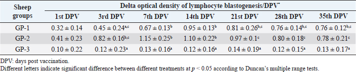DiscussionThe results of cellular immunity were coming as stated by Knudsen et al. (1979), who reported that cell-mediated immune response was a constitute of immune response against FMDV, and Garcia et al. (1996), Elwatany et al. (1999), Sonia et al. (2010), and Fakhry et al. (2012) mentioned that the delta optical density of lymphocyte blastogenesis assay and IL-6 at 0, 3, 7, 14, 21, and 28 -DPV showed that a significant difference between vaccinated and control groups started at 3rd DPV and increased gradually till 21st DPV using trivalent FMD Montanide inactivated vaccine. Also, our result come in parallel to El-Din et al. (2014) who concluded that the Egyptian trivalent FMD oil vaccine showed a maximum cellular immune response at 21 DPV. The results of humoral immunity came in parallel with the result obtained by Ibrahim et al. (2015) who indicated that vaccines emulsified using Montanide ISA 201 adjuvant elicited a protective humoral immune response from the 2nd WPV for ISA 201 oil by SNT and ELISA titers of (1.62 ± 0.047a and 1.8 ± 0.049a); (1.59 ± 0.076a and 1.836 ± 0.077a) and (1.71 ± 0.06b and 1.96 ± 0.074b) by SNT and ELISA for serotypes O, A, SAT2, respectively, and ISA 206 showed antibody titer by SNT and ELISA of (1.5 ± 0.082a and 1.84 ± 0.084a); (1.56 ± 0.037a and 1.818 ± 0.052a) and (1.5 ± 0.106a,b and 1.81 ± 0.104a,b) for FMDV serotypes O, A, and SAT2, respectively. Our results also were consistent with the statement of Hamblin et al. (1986), who explained that the SNT measures those antibodies which neutralize the infectivity of FMD virion, while ELISA probably measure all classes of antibodies even those produced against incomplete and non-infectious virus. In addition, these results agree with those obtained by Selim et al. (2010) who reported that the mean antibody titers against FMD vaccine strain O1/3/93 were detected in sheep sera vaccinated with Alumhydroxide gel vaccine following one WPV by SNT, whereas, the mean peak titers (1.9 log10) by SNT were detected by the 6th week post-vaccination. Our results also agreed with Mohamed et al. (2013) who used FMD ISA 206 oil bivalent vaccine alone and noticed that the specific FMD neutralizing antibody titer reached a protective level starting from the 4th WPV to record peak titer by the 16th WPV and then declined gradually afterward. El-Sayed et al. (2012) reported that vaccination of calves with the locally produced bivalent FMD adjuvant vaccine induced higher antibody titer than the recommended protective level (1.5 log10 for SNT and 1.8 log10 for ELISA) for type A and O estimated by SNT and ELISA. This antibody titer remained within the protective level up to 34 WPV. El-Din et al. (2014) concluded that the Egyptian trivalent FMD oil vaccine-induced protective humoral immune response extended for 32 WPV. The obtained high levels of FMD immune response in vaccinate sheep receiving BV could be attributed to effect of BV as immunomodulator which stimulates immune system to protect the body against infection by its stimulation of prostaglandin generation which have biological activities resulting in stimulation of IL-10, TNF alpha, and CD8 which result in regulation in IgE which responsible for histamine release (Rekka et al., 1990). Eiaka et al. (2016) found that following up rabies antibodies in vaccinated dogs using SNT revealed that BV induced the highest levels of antibodies (128) when inoculated before and simultaneously with vaccination by rabies vaccine. Rabies vaccine alone or before inoculation of BV induced lower titers of antibodies (32 and 64, respectively) by the fourth week post-vaccination. Also, ELISA confirming came parallel to those of SNT revealing that BV induced the highest levels of antibodies (7 and 6 log2, respectively) when inoculated before and simultaneously with vaccination by rabies vaccine and rabies vaccine alone or before inoculation of BV induced lower ELISA titers (5 log2) by the fourth week post-vaccination. Depending on the demonstrated data it could be concluded that BV enhances the immune response of vaccinated sheep to the trivalent FMD vaccine resulted in earlier induction of specific FMD serotypes antibodies than in the case of administration of the vaccine alone reaching their peak on earlier time with prolonged duration of immunity. ReferencesAntley, P.P. and Hazen, K.C. 1988. Role of yeast cell growth temperature on Candida albicans virulence in mice. Infect. Immun. 56(11), 2884–2890. Carr, B.V., Lefevre, E.A., Windsor, M.A., Inghese, C., Gubbins, S., Prentice, H., Juleff, N.D. and Charleston, B. 2013. CD4+ T-cell responses to foot-and-mouth disease virus in vaccinated cattle. J. Gen. Virol. 94(Pt 1), 97–107. Depa, P.M., Dimri, U., Sharma, M.C. and Tiwari, R. 2012. Update on epidemiology and control of foot and mouth disease—a menace to international trade and global animal enterprise. Vet. World 5(11), 694–704. Eiaka, A.M., El-Bagoury, G.F., El-Nahas, E.M. and Khodeir, M.H. 2016. Investigation of the effect of bee venom on the immune response of dogs to rabies vaccine. BVMJ 31(2), 254–257. El-Din, W.M.G., EES, I.H. and Ali, S.M. 2014. Humeral and cellular immune response of Egyptian trivalent foot and mouth disease oil vaccine in sheep. Res. Opin. Anim. Vet. Sci. 4(4), 178–185. El-Mayet, F.S., Sharawi, S.S.A., EL-Habbaa, A.S., Shahen, N.M. and Hagaa, N.M. 2020. Rapid detection and isolation of foot and mouth disease virus in samples from clinically suspected animals in Egypt during 2016–2019. BVMJ 39, 135–140. EL-Naggar, H. 2012. Preparation of inactivated lyophilized NDV vaccine. M.V.Sc. in Veterinary Science (Virology) Thesis, Cairo University, Cairo, Egypt. El-Sayed, E., Gamal El-Din, W.M., Rizk, S.A. and Abd El-Aty, M. 2012. Effect of different storage temperatures on the efficacy of the bivalent foot and mouth disease oil vaccine. J. Adv. Vet. Res. 2, 198–205. Elwatany, H., Shawky, M., Rhshdy, O.H. and El-Kelany, S. 1999. Relationship between 