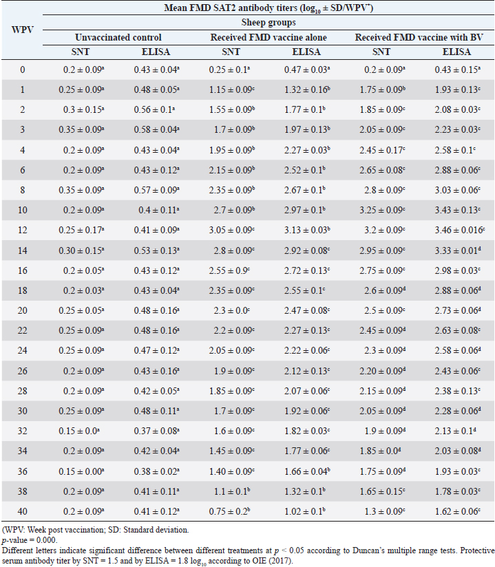 Monitoring of sheep immune response to FMD vaccine alone or with BV through application of SNT and solid phase indirect ELISA; revealed that vaccinated sheep exhibited FMD serotype O protective antibody titers (1.55 ± 0.09 and 1.77 ± 0.1 log10 by SNT and ELISA, respectively, by the second week post-vaccination with FMD vaccine alone. These values were higher with administration of BV (1.70 ± 0.09 and 1.93 ± 0.13 log10 by SNT and ELISA, respectively) by the first week post-vaccination. These titers recorded their peaks (2.97 ± 0.03 log10 by SNT and 3.13 ± 0.03 log10 by ELISA) on the 12th WPV and 3.2 ± 0.05 log10 by SNT and 3.43 ± 0.03 log10 by ELISA on the 10th WPV using the vaccine alone and with BV, respectively. FMD antibodies were gradually decreased to reach its lowest protective levels (1.55 ± 0.9 log10 by SNT and 1.77 ± 0.06 log10 by ELISA) on the 34th WPV with FMD vaccine alone while in the case of administration of BV these values were (1.55 ± 0.09 log10 by SNT and 1.78 ± 0.03 log10 by ELISA) on the 38th WPV. Non-protective FMD serotype O antibody titers (less than 1.5 and 1.8 log10 by SNT and ELISA, respectively) were recorded by the 36th and 40th WPV with FMD vaccine alone and with BV, respectively. These results are demonstrated in Table 6. Table 6. Mean FMD serotype O serum neutralizing antibody and ELISA titers in vaccinated sheep.
