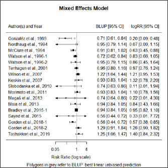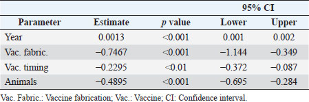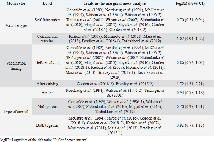 Moderators and source of heterogeneityWhile considering all the trials (excluding however and for the reasons explained), (Bradley et al., 2015-2) the best fit was reached with a mixed effects model, containing four significant moderators explaining all the variability (Q=27.99; p < 0.001). These moderators are the covariate “year of publication” (p < 0.001), and the factors “vaccine fabrication” (p < 0.001), “vaccination timing” (p < 0.001), and “animals used in the trial” (p=0.02). The model does not show heterogeneity (Q=18.21; p=0.15), explaining therefore all the variability (τ2=0.0000, SE=0.0065; I2=0.00%; H2=1.00). While conducting this meta-analysis it was difficult to find common grounds to include some studies. To be able to compare studies, the same type of procedures and outcome variables needed to be considered. Due to the different methodologies and reporting techniques used by different authors, limitations for the inclusion of several studies were identified, as previously indicated. The relatively small number of trials included in this meta-analysis is a limitation factor. No interactions were produced due to the lack of studies, replicating the combinations between the levels of the several factors. In the group analysis, each of the significant moderators were analyzed individually and, therefore, no other moderators are considered once no interactions are present.