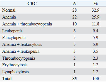 AbstractBackground: In clinical routine, it can happen that to an abnormal hemogram corresponds an unexpected cytological normal bone marrow examination that can be difficult to interpret and to manage. Aim: This cytologically retrospective study wants to evaluate a consistent number of qualitative and quantitative normal bone marrow exams according to the hematological and clinical-pathological data to judge if this normality is by itself a pathologic state. Methods: Six hundred and thirteen bone marrow samples were examined. The bone marrow cytological examinations were performed using morphological and numerical criteria together with a complete hemogram, after the identification of clinical or hematological alterations such as multiple lymph nodes enlarged, positive leishmania serological result, staging of neoplasia, cytopenia, increased number of cells, or suspicion of malignant blood disorders. Results: Of the 613 bone marrow samples evaluated, 85 (14%) were classified as normal or without cytological abnormalities; however, only 28 (33%) of those cases had a normal hemogram associated, whereas 55 (65%) had one or more cytopenia and 2 (2%) had increased blood cells count. Conclusion: From this study emerges that cytological bone marrow examinations without any morphological or numerical abnormalities are often associated with altered hematological exams and for this reason, they should not be considered normal and should lead to other deepened investigations. Keywords: Canine, Bone marrow, Cytological examination, Hemogram data. IntroductionBlood and bone marrow cytological examination represents the unique tool to explore the hematopoietic tissue that can be altered by several intrinsic and extrinsic conditions. As a rule, a significant hemogram alteration, like for example non-regenerative anemia, persistent neutropenia or thrombocytopenia, abnormal blood cell morphology, unexplained elevations in blood cell numbers or presence of immature cells in peripheral blood leads to a bone marrow cytological plus or menus histological examination, depending on the case. Very often the bone marrow appears modified, and, for example, it can be stimulated in response to the peripheral cytopenia, or it can appear depressed if it has been damaged by infectious agents or toxin or it can be altered by a neoplastic transformation of the hematopoietic cells. Anyway, to an abnormal hemogram usually corresponds an altered bone marrow that can help to understand the underlying disease or sometimes lead to a definitive diagnosis (malignant hemopathies or leishmania infection, for example). However, it can happen that to an abnormal hemogram corresponds an unexpected cytological normal bone marrow examination that can be difficult to interpret and to manage. Other important indications of bone marrow cytological examination, that are not always related to hemogram alterations and that can be associated to normal cytology-histology are hypercalcemia, hyperproteinemia, fever of unexplained origin, staging for malignancies, and monitoring of chemotherapy administration (Harvey, 2012; Raskin and Messick, 2012; Turinelli et al., 2015). However, in those cases, a normal bone marrow cytology or histology should not pose real interpretative problems. So far, few retrospective studies of bone marrow examination have been published and only one study provided bone marrow differential cell counting for different diseases (Weiss, 2006; Turinelli et al., 2015). The aim of this study was to provide a general overview regarding the prevalence of canine normal bone marrow cytological exam in correlation with the hemogram and clinical-pathological data and to investigate if this normality can be inappropriate and can be considered by itself a pathologic state. Materials and MethodsCanine bone marrow samples examined over a 5-year period were retrospectively reviewed. Six hundred and thirteen bone marrow aspirate samples were classified using cytological and numerical criteria. The bone marrow cytological examinations were performed after the identification of clinical and/or hematological alterations such as multiple lymph nodes enlarged, positive leishmania serological test, staging of neoplasia, cytopenia, increased number of cells, or suspicion of malignant blood disorders. A complete blood count (CBC) including blood film examination performed within 24 hours of bone marrow collection was carried out for all patients. The instrumental CBC data were obtained with the hematology analyzer Advia 120 Hematology System®, Siemens (Germany). Anemia, thrombocytopenia, and neutropenia were diagnosed when the hemoglobin concentration was less than 13.4 g/dl, platelets less than 143,000/μl, and neutrophils less than 2,940/μl, respectively. Erythrocytosis, thrombocytosis, and leukocytosis were diagnosed when the total erythrocyte count was greater than 8,700,000/μl, platelet count greater than 448,000/μl and leukocyte count greater than 17,600/μl (with lymphocytosis considered when the total lymphocytes exceeded 4,950/μl), respectively. Less than 10% of cases had concurrent bone marrow core biopsy collected. Bone marrow sampling was performed from various sites including proximal humerus, iliac crest, or trochanteric fossa of the proximal femur, cost-chondral junction of the 7th, 8th, and 9th ribs and the 3rd, 4th, 5th sternebra. Bone marrow aspirate smears were prepared through a squash technique, immediately after sample collection of live animals. Aspirates were stained with May Grünwald Giemsa. All the bone marrow samples were reviewed by a single-boarded clinical pathologist using a standardized method. The first step of the analysis was assessment of sample quality. Only samples with at least 8–10 unit particles (even if these particles were on multiple different slides) were included in the study (Fig. 1). All samples of inadequate quality (i.e. poor cellularity or crushed or formalin-fixed samples) were exclu