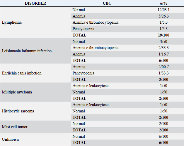 In the altered hemogram group few cases of increased number of cells were found: 5 (5.9%) were characterized by an association of anemia and neutrophilic leukocytosis, 1 (1.2%) was an erythrocytosis and 1 (1.2%) a lymphocytosis. The number of neutrophils within the blood of dogs depends on several factors, including rate of release from the bone marrow, shifting of neutrophils between the marginal pool and the circulating pool in the blood and the emigration rate of neutrophils from blood into tissue. For this reason, it is possible that a neutrophilia could be associated to a normal myelogram (Shultze, 2000). Moreover, in the dog, the marrow neutrophils reserve is very important and contains approximately a 5-day supply of cells. This means that in those cases a recent stimulus could have called back the marrow storage neutrophils in the peripheral blood without evidence of a myeloid-granulocytic stimulation (Graham, 2000). Probably a second bone marrow exam performed some days after, could have been altered and a myeloid hyperplasia could have been found. Table 3. Hemogram data of the principal bone marrow disorders/indications.