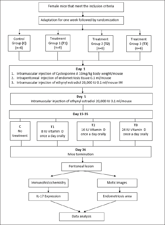 AbstractBackground: Endometriosis is a common, benign, estrogen-dependent, and chronic gynecological disease. Immune system disturbance and inflammatory abnormalities were involved in the pathogenesis of endometriosis. Therefore, it is logical to use vitamin D, which has an immunomodulatory capacity, as supportive therapy for endometriosis. Aim: This research aimed to study the effect of different doses of vitamin D on Interleukin-17 (IL-17) expression in endometriosis mice models. Methods: Endometriosis was induced in 24 mice divided into 4 groups of 6. Group C received no treatment, while groups T1, T2, and T3 received graded doses of oral vitamin D, sequentially 8, 16, and 24 IU, for 3 weeks. IL-17 expression and the extent of endometriotic peritoneal lesions were then measured and analyzed. Statistical tests were performed to see the difference in the mean area of endometriosis lesions and IL-17 expression between the control and treatment groups, as well as the correlation between the extent of endometriosis lesions and IL-17. Results: Endometriosis lesions decreased after 16 and 24 IU of vitamin D administration (p 0.023 and 0.009). Endometriosis lesion also tends to be smaller after 8 IU of vitamin D supplementation, although insignificant (p > 0.05). IL-17 expression was significantly lower after 24 IU vitamin D administration compared to the untreated group (p=0.004). Lower IL-17 expressions were also observed after 8 and 16 IU vitamin D administration, although insignificant (p=0.452 and p=0.645). IL-17 expression was moderately and positively correlated with the extent of endometriosis lesions (p=0.012, rho=0.505). Conclusion: By modulating the expression of IL-17 in endometriotic lesions, vitamin D inhibited the development of endometriotic lesions in the endometriosis mice model. The recommended vitamin D dose in this study was 24 IU. Keywords: Endometriosis lesion, Interleukin-17, Reproductive, Vitamin D. IntroductionEndometriosis is a relatively common benign, estrogen-dependent, and chronic gynecological disorder (Giudice and Kao, 2004; Zondervan et al., 2020). The prevalence ranges from 10% in the reproductive-age female to 50% in infertile women (Hendarto, 2015; Zondervan et al., 2020). Endometriosis clinical manifestations include dysmenorrhea, dyspareunia, chronic pain, and infertility. This disease affects the body and mind, causing depression, anxiety, and impaired social relationships. Endometriosis also reduces work productivity due to fatigue, psychological burden, and excessive health resource usage (Della Corte et al., 2020; Mińko et al., 2021; Eisenberg et al., 2022). Eisenberg et al. (2022) stated that endometriosis patients were 1.6 times more likely to see a gynecologist and twice as likely to be hospitalized annually. Endometriosis patients also significantly used more analgesics, particularly narcotic-like medications (Eisenberg et al., 2022). Endometriosis was also associated with higher total healthcare costs (Della Corte et al., 2020; Eisenberg et al., 2022). Overall, endometriosis reduces the quality of life and burdens patients, their partners, and their families (Nnoaham et al., 2011; Della Corte et al., 2020). Endometrial cells can implant and grow in ectopic locations due to retrograde menstruation, hormonal factors, immune system abnormalities, and chronic inflammation (Parasar et al., 2017). Interleukin-17 (IL-17) is one of the cytokines that contribute to the development of endometrial lesions and is associated with the severity of endometriosis (Izumi et al., 2018). IL-17 has several known roles in endometriosis, including macrophage chemotaxis, macrophage polarization to a pathogenic M2 phenotype, and inflammatory factor stimulation (Hirata et al., 2008; Kuwabara et al., 2017; Miller et al., 2020). It can be concluded that IL-17 plays an essential role in the development of the disease. Therefore, therapy that regulates the action of IL-17 has the potential to inhibit the development of endometriosis. Endometriosis is a chronic condition with a high recurrence rate (Brosens et al., 2013). Ideas for alternative and supportive therapies are being developed to overcome therapeutic limitations (Bedaiwy et al., 2017). Because endometriosis patient has immune system disorders and inflammatory abnormalities, it is logical to use Vitamin D, which has immunomodulatory property, as supportive therapy. Vitamin D deficiency is linked with endometriosis and is inversely related to the extent and severity of endometriosis (Miyashita et al., 2016; Anastasi et al., 2017; Ciavattini et al., 2017). Studies showed that Vitamin D had anti-mitogenic effects, inhibited angiogenesis through regulation of Vascular Endothelial Growth Factor (VEGF) expression, and decreased ectopic endometrial cell invasion (Abbas et al., 2013; Yildirim et al., 2014; Delbandi et al., 2016; Miyashita et al., 2016; Cermisoni et al., 2018). It is thought that vitamin D can modulate endometriosis through other modulating pathways. Vitamin D has been reported to decrease the number of IL-17-producing cells, inhibit the differentiation of CD4+ T cells into Th17 cells, and repress IL-17 expression (Bruce et al., 2011; Joshi et al., 2011). Although vitamin D is known to improve the profile of various autoimmune diseases, the effect of vitamin D on IL-17 expression in endometriosis has not been researched yet (Bruce et al., 2011; Joshi et al., 2011; Bhargava et al., 2015; Aly et al., 2017; Xia et al., 2019; Ghorbani et al., 2021; Mahmoud et al., 2021). Based on those studies, it can be extrapolated that Vitamin D can regulate IL-17 expression in endometriosis. Therefore, this study proposed the regulatory pathway of endometriosis by modulation of IL-17 expression. So far, there have been pitfalls in translating in vitro and in vivo research into applied clinical research. These flaws include the inappropriate way of administering vitamin D when translated to human subjects and the use of supr