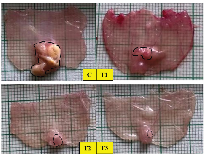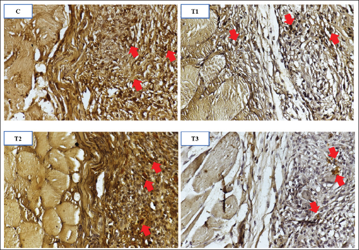 Fig. 3. Comparison of IL-17 expression in endometriosis cells in each treatment group. Red arrows indicate the presence of IL-17 expression in endometriosis cells. C: control group; T1: treatment group given 8 IU of Vitamin D; T2: treatment group given 16 IU of Vitamin D; T3: treatment group given 24 IU of Vitamin D. DiscussionThis research evaluated the effect of vitamin D on the endometriosis mice model. The extent of endometriosis area and IL-17 expression was assessed. We divided 24 mice equally into 4 groups, 3 treatment groups, and 1 control group. The treatment groups were given graded doses of 8, 16, and 24 IU. The results indicated that 16 and 24 IU vitamin D decreased endometriosis lesions in mice. A smaller area of endometriosis in mice given 8 IU of vitamin D versus those not treated was also observed, though they were insignificant. IL-17 expression is significantly lower in the endometriosis mice model given 24 IU of vitamin D versus the untreated group. The IL-17 expression also showed decreased tendencies with the administration of 8 and 16 IU of vitamin D, although insignificant. This study also observed a positive correlation between IL-17 expression and the extent of endometriosis lesions in the endometriosis mice model.