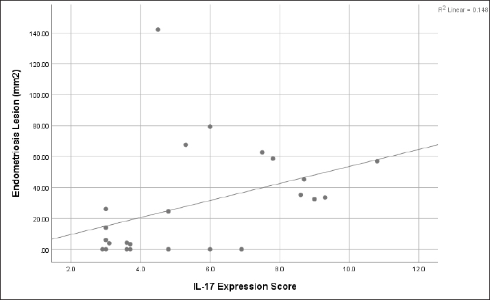 Fig. 4. The scatter-plot graph showing the correlation between IL-17 expression score and endometriosis lesions. The heterologous endometriosis induction method was used in this study, which involved injecting human endometrial tissue into the intraperitoneal cavity of mice. This study’s model was a mild endometriosis type. Lesions caused by this method are typically white or red to brownish cystic lesions or dark solid peritoneal tumors. This method excels at studying disease in its early stages, such as angiogenesis, apoptotic defects, endometrial proliferation, and inflammation. This method is similar to the pathophysiology of retrograde menstruation in humans. Another advantage is that because this heterologous model is based on human endometrial tissue, its development is thought to mimic human endometriosis lesions (Taniguchi et al., 2021). Because it depends on the amount of tissue and the size of the injected endometrial fragments, this method had limitations regarding the number, distribution, and phenotype of endometrial lesions (Burns et al., 2022). Another disadvantage is that mice, as a nonmenstruating species, may not accurately reflect all aspects of endometriosis pathophysiology (Taniguchi et al., 2021). This study demonstrates that the untreated group of endometriosis mice model had the largest endometriosis lesion area. These data are consistent with the theory and other studies mentioned before. The extent of endometriotic lesions reflects the severity of endometriosis according to the ASRM category. Endometriotic lesions in the peritoneal cavity implant are closely associated with various immune cells (Izumi et al., 2018). The recruitment of immune cells, cell adhesion, and an increase in the inflammatory process promote endometrial cell implantation and survival (Agostinis et al., 2021). The ability of ectopic endometrial cells to invade the basement membrane, as well as angiogenesis originating from nearby vascularization or incorporation of circulating endothelial precursor cells near the vascularization site, all influence the development of endometrial lesions (Burney and Giudice, 2012; Capobianco and Rovere-Querini, 2013). Endometrial lesions have thus been linked to uncontrolled growth, invasion of surrounding tissues, defective apoptosis, neoangiogenesis, and a persistent inflammatory response. The vitamin D-treated endometriosis mice model consistently had a smaller area of endometriosis lesions. The smallest to largest mean lesion area in the endometriosis mice model given vitamin D was obtained at doses of 24, 16, and 8 IU, respectively. According to the analysis, the data were statistically significant at 16 and 24 IU doses. In this study, IL-17 expression was highest in untreated endometriosis models. This result is consistent with other research that has found an increase in the number of Th-17 cells and IL-17 levels in endometriosis (Hirata et al., 2008; Ahn et al., 2015; Miller et al., 2020). IL-17 has been linked to many autoimmune disorders and chronic inflammatory conditions such as endometriosis (Kuwabara et al., 2017; Miller et al., 2020). This cytokine is made up of six homologous molecules known as IL-17A–IL-17F. The IL-17 receptor (IL-17R) is made up of five homologous sequences (IL-17Ra, IL-17RB, IL-17RC, IL-17RD, and IL-17RE) (Kuwabara et al., 2017). Chemotactic, macrophage polarization induction, cytokine stimulation, angiogenic factor stimulation, COX2 expression induction, and endometriotic stromal cell proliferation are all roles of IL-17A in the pathogenesis of endometriosis (Hirata et al., 2008; Ahn et al., 2015; Miller et al., 2020). Early disease onset is linked to endometriosis progression via macrophage recruitment and polarization and increased cytokine production (Miller et al., 2020). Thus, IL-17 is linked to impaired immune clearance, endometrial cell adhesion at ectopic sites, and invasion of these cells into tissues at ectopic sites. These processes allow endometrial cells at ectopic sites to develop into endometrial lesions. The administration of vitamin D in this study’s treatment group reduced the expression of IL-17 compared to the control group. The trend of decreasing IL-17 expression was consistent across all vitamin D groups. Statistical analysis revealed a significant difference in IL-17 expression between the endometriosis mice model given vitamin D at a dose of 24 IU and mice not given treatment. At serum vitamin D levels greater than 20 ng/ml, vitamin D supplementation is known to regulate IL-17 and improve the profile of various autoimmune diseases (Bruce et al., 2011; Joshi et al., 2011; Bhargava et al., 2015; Aly et al., 2017; Xia et al., 2019; Ghorbani et al., 2021; Mahmoud et al., 2021). Roffe-Vazquez et al. (2019) discovered a negative relationship between serum vitamin D levels and IL-17A. This happened in long-term systemic inflammatory conditions and was accompanied by vitamin D deficiency in adult heart failure patients (Roffe-Vazquez et al., 2019). Vitamin D immunomodulation of IL-17 can occur through a decrease in the number of IL-17-producing cells, inhibition of CD4+ T cell differentiation into Th17 cells, and a repressive effect on IL-17 expression (Bruce et al., 2011; Joshi et al., 2011). The repressive effect is caused by the vitamin D receptor’s transcription suppression mechanism, which inhibits the Il-17/Il-17R pathway (Joshi et al., 2011; Xia et al., 2019). IL-17 is one factor contributing to the overall development of endometrial lesions. This study showed a moderate relationship between IL-17 and the severity of endometriosis lesions. In this study, administering 24 IU of Vitamin D resulted in the lowest IL-17 expression and the smallest endometriosis lesion area. The study demonstrated that vitamin D inhibits the development of endometriosis lesions via IL-17 expression regulation. Other studies have shown that endometrial lesions can be prevented from spreading through other pathway