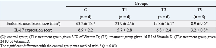 Fig. 2. Cross-section of the peritoneum and endometriotic lesions in endometriosis models of mice in groups C, T1, T2, and T3 at termination. The black dotted line indicates an endometriosis lesion. C: control group; T1: treatment group given 8 IU of Vitamin D; T2: treatment group given 16 IU of Vitamin D; T3: treatment group given 24 IU of Vitamin D. Ethical approvalThe Animal Care and Use Committee, Faculty of Veterinary Medicine, Universitas Airlangga, had ethically approved this study (number 2.KE.143.12.2021). All procedures followed the research policy on Animal Ethics. ResultsEndometriosis lesionEndometriosis lesions were observed in the peritoneal cross-section slide prepared from mice. Figure 2 shows endometriosis lesions from each group. The average area of endometriosis lesions is shown in Table 1. The mean area of endometriosis in the treatment groups T1 (23.9 ± 27.6 mm2), T2 (15.8 ± 16.1 mm2), and T3 (8.9 ± 9.6 mm2) was lower compared to the untreated group (63.2 ± 45.7 mm2). Analysis of variances test showed p: 0.008, meaning a significant difference between the control and treatment groups. Tukey’s HSD post-hoc test showed significant differences between T2 and T3 compared to the C group (p: 0.023 and p: 0.009). IL-17 expressionThe image of endometriosis cells expressing IL-17 is shown in Figure 3 and is indicated by red arrows at 400× magnification. IL-17 was expressed in all mice group slides, with the strongest expression in group C and the weakest in group T3. Although they were weaker than the control group, the T2 group slides provided a stronger expression picture than the other treatment groups. The average score of IL-17 expression is shown in Table 1. The mean IL-17 expression scores in group T1 (5.7 ± 2.8), T2 (6.3 ± 2.4), and T3 (3.2 ± 0.3) are lower than the group C (6.9 ± 2.2). Kruskal–Wallis test showed a significant difference between the treatment and control group (p: 0.029). Mann–Whitney test showed a significant difference in the P3 group (p: 0.004) but not in P1 and P2 (p: 0.452 and p: 0.645). Relationship between IL-17 expression and endometriosis lesion areaThe Spearman correlation test examined the relationship between the IL-17 expression and the extent of endometriosis lesions. The scatter plot image in Figure 4 shows the linearity between variables. The test yielded a p-value of 0.012 and a correlation coefficient of 0.505. Table 1. The mean and standard deviation of endometriosis lesion area and IL-17 expression in endometriosis mice model in the control and vitamin D treatment groups.