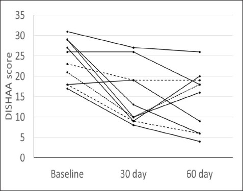 Fig. 1. DISHAA scores (y-axis) plotted against time (x-axis) for 10 dogs. Encouragingly, only one dog had a one-point higher DISHAA score at 30 days than at baseline, and another dog had the same score at 30 days as at baseline. However, DISHAA scores in both dogs decreased at 60 days. It is possible that these two dogs were simply not as responsive to the supplement as others in the study. It is also possible that the delayed response could reflect variability in metabolism of the supplement ingredients among dogs. Somewhat concerning was the rise in DISHAA scores in three dogs at 60 days (compared to the 30-day scores). Nevertheless, in all three dogs, these scores remained lower at 60 days than at baseline. Considering that CCD, like human AD, is a progressive disorder, the rise in DISHAA scores during the second half of the evaluation period may reflect disease progression in these patients. As with all uncontrolled clinical trials that use subjective measures of effect, the risk of client bias could have resulted in a more favorable outcome than might be real. It is possible that clients were more attentive to their dogs during the study period than usual, which could have influenced their answers to the questionnaire forms. More objective and non-biased methods of cognitive testing are available for evaluating dogs with CCD, including delayed nonmatching to positioning memory tasks, attention tasks, food searching tasks, and problem-solving tasks (Landsberg et al., 2012; Chapagain et al., 2018; Gonzalez-Martinez et al., 2013). Despite the limitations of this preliminary study, our observations warrant further investigation into the efficacy and tolerability of CogniCaps® in a larger cohort of dogs with CCD with a placebo control and more stringent behavioral testing. In addition to investigating this supplement via a placebo-controlled study, long-term follow-up would be useful information, considering the progressive nature of CCD. Conflict of interestDr. Dewey formulated CogniCaps® and receives a percentage of sales. ReferencesBednarikova, Z., Gancar, M., Wang, R., Zheng, L., Tang, Y., Luo, Y., Huang, Y., Spodniakova, B., Ma, L. and Gazova, Z. 2021. Extracts from Chinese herbs with anti-amyloid and neuroprotective activities. Int. J. Biol. Macromol. 179, 475–484. Chang, D., Liu, J., Bilinski, K., Xu, L., Steiner, G.Z., Seto, S.W. and Bensoussan, A. 2016. Herbal medicine for the treatment of vascular dementia: an overview of scientific evidence. Evid. Based Complement Alternat. Med. 2016, 7293626. Chapagain, D., Range, F., Huber, L. and Viranyi, Z. 2018. Cognitive aging in dogs. Gerontology 64(2), 165–171. Dewey, C.W., Davies, E.S., Xie, H. and Wakshlag, J.J. 2019. Canine cognitive dysfunction: pathophysiology, diagnosis, and treatment. Vet. Clin. North Am. Small Anim. Pract. 49, 477–499. Gonzalez-Martinez, A., Rosado, B., Pesini, P., Garcia-Belenguer, S., Palacio, J., Villegas, A., Suarez, M.L., Santamarina, G. and Sarasa, M. 2013. Effect of age and severity of cognitive dysfunction on two simple tasks in pet dogs. Vet. J. 198(1), 176–181. Jiang, Y., Gao, H. and Turdu, G. 2017. Traditional Chinese medicinal herbs as potential AChE inhibitors for anti-Alzheimer’s disease: A review. Bioorg. Chem. 75, 50–61. Landsberg, G.M., Nichol, J. and Araujo, J.A. 2012. Cognitive dysfunction syndrome: a disease of canine and feline brain aging. Vet. Clin. North Am. Small Anim. Pract. 42, 749–768. Libro, R., Giacoppo, S., Soundara Rajan, T., Bramanti, P. and Mazzon, E. 2016. Natural Phytochemicals in the Treatment and Prevention of Dementia: An Overview. Molecules 21(4), 518. Makkar, R., Behl, T., Bungau, S., Zengin, G., Mehta, V., Kumar, A., Uddin, M.S., Ashraf, G.M., Abdel-DAim, M.M., Arora, S. and Oancea, R. 2020. Nutraceuticals in neurological disorders. Int. J. Mol. Sci. 21(12), 4424. Pan, Y., Landsberg, G., Mougeot, I., Kelly, S., Xu, H., Bhatnagar, S., Gardner, C.L. and Milgram, N.W. 2018. Efficacy of a therapeutic diet on dogs with signs of cognitive dysfunction syndrome (CDS): a prospective double blinded placebo controlled clinical study. Front. Nutr. 12(5), 1–10. Tewari, D., Stankiewicz, A.M., Mocan, A., Sah, A.N., Tzvetkov, N.T., Huminiecki, L., Horbańczuk, J.O. and Atanasov, A.G. 2018. Ethnopharmacological approaches for dementia therapy and significance of natural products and herbal drugs. Front. Aging Neurosci. 10, 3. Yang, X., Dai, G., Li, G. and Yang, E.S. 2009. Coenzyme Q10 Reduces β-amyloid plaque in an APP/PS1 transgenic mouse model of Alzheimer’s disease. J. Mol. Neurosci. 41(1), 110–113. Zhou, X., Venigalla, M., Raju, R. and Münch, G. 2022. Pharmacological considerations for treating neuroinflammation with curcumin in Alzheimer’s disease. J. Neural. Transm. 129(5–6), 755–771. | ||