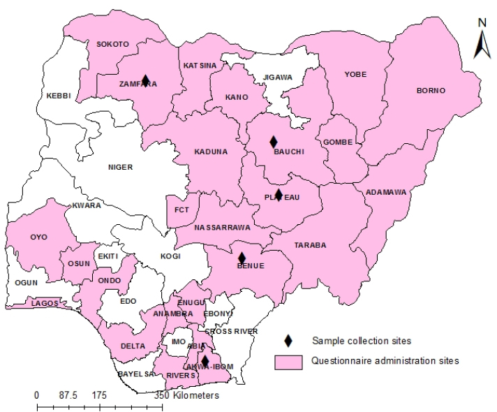 Fig. 1. Map of Nigeria showing states where the questionnaire survey was carried out and samples collected. Data analysisData obtained from the questionnaires were entered into a spreadsheet and analyzed using descriptive statistics and tabulated. Phylogenetic analysis of A32L and B2L genes of ORFVEight ORFV positive samples were selected showing spatial temporal spread for molecular characterization targeting two genes of the virus (Table 1). The A32L gene of ORFV encoding an ATPase that mediates virion DNA packaging and the B2L envelope gene which are the highly immunogenic proteins were charactered using the Sanger sequencing method (Chan et al., 2009; Gelaye et al., 2016). ORFV sequences were generated commercially by Macrogen Inc. (South Korea). The raw sequence data were assembled using Staden Package (http://staden.sourceforge.net/) and multiple alignments were performed using the MUSCLE condon algorithm implemented in MEGA X (Kumar et al., 2018). Sequences of the two gene segments of ORFV were compared to available sequences in the GenBank using the Basic Local Alignment Search Tool (BLAST) (https://blast.ncbi.nlm.nih.gov/Blast) at default settings. MEGA X was used for phylogenic analysis by Neighbor-joining tree inferred using p-distance method and data resampled 1,000 times in bootstrap method (Kumar et al., 2018).To construct the phylogenic trees, 13 A32L and 15 B2Lgene sequences representing the two known ORFV clusters as well as the sequences of BSPV and PCPV were retrieved from GenBank, and listed in Table 2 (Gelaye et al., 2016). The nucleotide sequences generated in this study were deposited in the NCBI GenBank sequence database with accession numbers MG757220–MG757227 for the A32L gene and MG757228–MG757235 for the B2L gene (Table 1). Table 1. List of Nigerian ORFV from field outbreaks and their GenBank accession numbers.