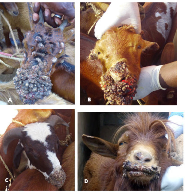 Fig. 2. (A): Proliferative lesions of CE around the mouth, nose and eyes of a Kano brown goat at a livestock market in Bauchi, Bauchi state. (B): Proliferative lesions of CE around the mouth, nose and eyes of a Kano brown goat in Bauchi, Bauchi state. (C): Scab lesions of CE on the mouth and nose of Yankasa ram in Gamawa, Bauchi state. (D): A Kano brown with proliferative lesions of CE in Kuru, Plateau. Table 4. Distribution of samples collected during CE outbreaks and laboratory results in five states of Nigeria from 2014 to 2016.