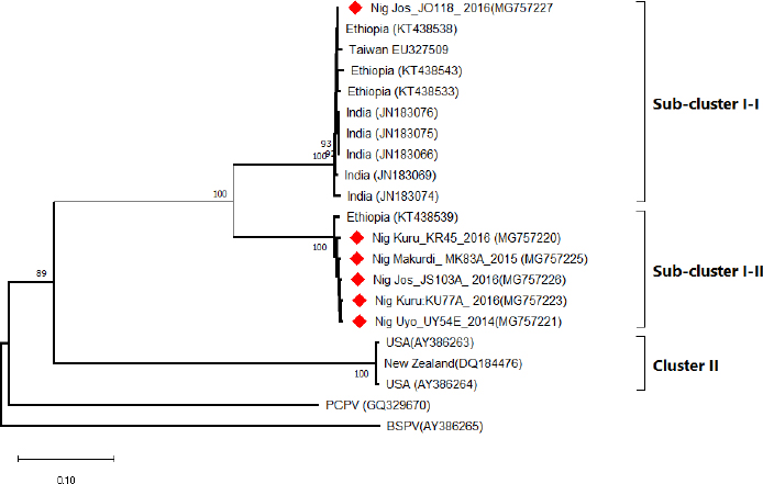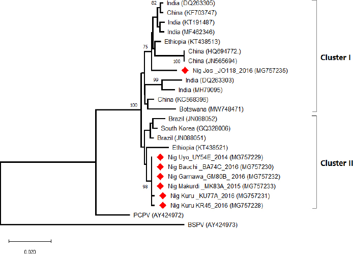 Fig. 4. The Phylogenic tree of the B2L gene of the ORFV collected from outbreaks in Nigeria. The Nigerian ORFV samples are marked with red. The tree was constructed using the neighbor-joining method at 1,000 bootstrap. ConclusionsThis study provides the first concise country-wide epidemiological data on CE in sheep and goats in Nigeria. It is also the first molecular characterization of two gene fragments of ORFV circulating and causing outbreaks in small ruminants. Findings from this study suggest that CE is an economically important disease of sheep and goats in Nigeria. It is, therefore, recommended that further studies be undertaken to investigate the impact of the disease on sheep and goat farming in the country. Conflict of interestThe authors declare that there is no conflict of interest. FundingThe authors of this study did not receive any form of funding. Authors’ contributionsAJA, MBB TYW, and VII designed the study, AJA, JAA, AAG, and NAM collected the data and samples. AJA, MBB, AJ, JAA, NCC, YSW, and PDL analysis data and samples. AJA, OOA, PDL, TYW wrote the manuscript. All authors read and approved the manuscript. AcknowledgmentsThe authors hereby acknowledge veterinarians, farmers, and abattoirs workers that participated in this study. The authors acknowledge Adrian Maguda, Dyek Yohonna Dyek, Dr. Ronke Odita, and Dr. David Lazarus who donated the positive controls. The authors also acknowledge the staff of Animal Production and Health Laboratory, Joint FAO/IAEA Laboratories Seibersdorf, Vienna Austria for HRMCA reagents used for the study. ReferencesAdedeji, A.J., Gamawa, A.A., Chima, N.C., Ahmed, A.I., Ifende, V.I., Adole, J.A., Ahmad, I., Woma, T.Y. and Luka, P.D. 2018. First report of camel contagious ecthyma in Nigeria. Open Vet. J. 8(2), 208–211. Adedeji, A.J., Adole, J.A., Chima, N.C., Maguda, A.S., Dyek, Y.D., Jambol, A., Anefu, E., Shallmizhil, J.J. and Luka, P.D. 2018. Contagious ecthyma in three flocks of goats in Jos-South, Plateau State, Nigeria. S. J. Vet. Sc. 16(1), 107–112. Adedeji, A.J., Maurice, N.A., Wungak, Y.S., Adole, J.A., Chima, N.C., Woma, T.Y., Chukwuedo, A.A. and Shamaki, D. 2017. Diagnosis of orf in West African Dwarf goats in Uyo, Akwa Ibom state, Nigeria. Afri. J. Infec. Dis. 11(2), 90–94. Andreani, J., Fongue, J., Bou Khalil, J.Y., David, L., Mougari, S., Le Bideau, M., Abrahão, J., Berbis, P. and La Scola, B. 2019. Human Infection with Orf Virus and description of its whole genome, France, 2017. Emerg. Infect. Dis. 25(12), 2197–2204. Bala, J.A., Balakrishnan, K.N., Abdullah, A.A., Mohamed, R.B., Haron, A.W., Jesse, F.F. and Mohd-Azmi, M.L. 2018. The re-emerging of orf virus infection: a call for surveillance, vaccination and effective control measures. Microb. Pathog. 120, 55–63. Bolajoko, M.B., Adedeji, A.J., Dashe, G.D., Òsemeke, O.H. and Luka, D. 2019. Molecular epidemiology and economic impact of goat pox on small holder sheep and goats farmers in North Central Nigeria. Small Rumin. Res. 179, 75–78. Bora, D.P., Barman, N.N., Das, S.K., Bhanuprakash, V., Yogisharadhya, R., Venkatesan, G., Kumar, A., Rajbongshi, G., Khatoon, E., Chakraborty, A. and Bujarbaruah, K.M. 2012. Identification and phylogenetic analysis of orf viruses isolated from outbreaks in goats of Assam, a northeastern state of India. Virus Gen. 45(1), 98–104. Chan, K.W., Yang, C.H., Lin, J.W., Wang, H.C., Lin, F.Y., Kuo, S.T., Wong, M.L. and Hsu, W.L. 2009. Phylogenetic analysis of parapoxviruses and the C-terminal heterogeneity of viral ATPase proteins. Gene 432(1–2), 44–53. Chi, X., Zeng, X., Hao, W., Li, M., Li, W., Huang, X., Wang, S. and Luo, S. 2013. Heterogeneity among orf virus isolates from goats in Fujian Province, Southern China. PLoS One 8(10), e66958. Delhon, G., Tulman, E.R., Afonso, C.L., Lu, Z., de la Concha Bermejillo, A., Lehmkuhl, H.D., Picone, M.E., Kutish, G.F. and Rock, D.L. 2004. Genomes of the parapoxviruses orf virus and bovine popular stomatitis virus. J. Virol. 78(1), 168–177. Essbauer, S., Pfeffer, M. and Meyer, H. 2010. Review Zoonotic poxviruses. Vet. Microbiol. 140(1), 229–236. Fadiga, M., Jost, C. and Ihedioha, J. 2013. Financial costs of disease burden, morbidity and mortality from priority livestock diseases in Nigeria: disease burden and cost–benefit analysis of targeted interventions. ILRI Res. Rep. Nairobi, Kenya pp: 1–84. Fleming, S.B., Wise, L.M. and Mercer, A.A. 2015. Molecular genetic analysis of orf virus: a poxvirus that has adapted to skin. Viruses 7(3), 1505–1539. Friederichs, S., Krebs, S., Blum, H., Wolf, E., Lang, H., von Buttlar, H. and Büttner, M. 2014. Comparative and retrospective molecular analysis of parapoxvirus (PPV) isolates. Virus Res. 181, 11–21. Gambo, P., Maguda, A.S., Adole, J.A., Dyek, Y.D., Ifende, V.I., Bot, C. and Adedeji, A.J. 2018. A survey of viral diseases of livestock characterized by skin lesions in Kanam Local Government Area of Plateau State, Nigeria. Nig. Vet. J. 39(3), 250–262. Gelaye, E., Achenbach, J.E., Jenberie, S., Ayelet, G., Belay, A., Yami, M., Loitsch, A., Grabherr, R., Diallo, A. and Lamien, C.E. 2016. Molecular characterization of orf virus from sheep and goats in Ethiopia, 2008–2013. Virol. J. 13(34); doi: 10.1186/s12985-016-0489-3. Gelaye, E., Mach, L., Kolodziejek, J., Grabherr, R., Loitsch, A., Achenbach, J. E., Nowotny, N., Diallo, A., & Lamien, C. E. 2017. A novel HRM assay for the simultaneous detection and differentiation of eight poxviruses of medical and veterinary importance. Sci. Rep. 7, 42892; doi: 10.1038/srep42892. Guo, J., Rasmussen, J., Wünschmann, A. and de la Concha-Bermejillo, A. 2004. Genetic characterization of orf viruses isolated from various ruminant species of a zoo. Vet. Microbiol. 99, 81–92. Hautaniemi, M., Ueda, N., Tuimala, J., Mercer, A.A., Lahdenpera, J. and McInnes, C.J. 2010. The genome of pseudocowpoxvirus: comparison of a reindeer isolate and a reference strain. J. Gen. Virol. 91, 1560–1576. Hosamani, M., Bhan