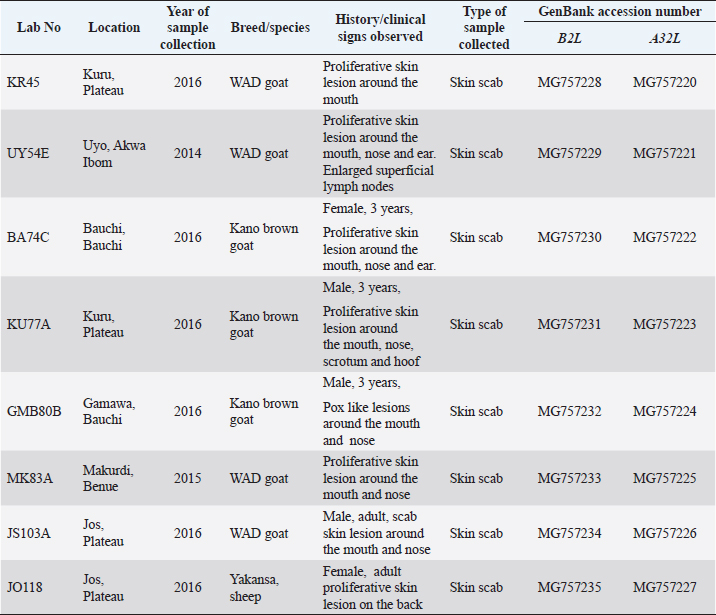 Ethical approvalThis study was approved by National Veterinary Research Institute Animal Ethics Committee (AEC/03/58/18). ResultsQuestionnaire data analysisSheep and goats farmers interviewed were from seven states of Nigeria (Akwa Ibom, Bauchi, Kano, Kaduna, Plateau, Yobe, Zamfara) (Fig. 1). The farmers interviewed were of ages 30–80 years old and 92.4% (n =109/118) of them practice extensive husbandry system of livestock of farming (Table 3). Data from the survey also revealed that 69.54% (n =82/118) of the farmers were familiar with CE and had observed CE outbreaks in their flocks at least once. Additionally, 31.4% (n=37/118) of the farmers said they had observed cases of CE in their flocks in the last year before the interview was conducted. Also, 69.54% (n =82/118) of the farmers indicated that CE is a disease of economic importance in Nigeria. Similarly, the analyzed data showed that 60.1% (n =79/118) of the farmers indicated that CE affects both young and adult animals, while 69.54% (n =82/118) of farmers claimed CE affects sheep and goats of both sexes. Furthermore, 60.1% of the farmers claimed that CE occurs during both dry and rainy seasons. Regarding breed of goats mostly affected, 58.5% (n=69/118, Table 3) stated that WAD as the breed of goats mostly affected by CE. At the same time, all the respondents did not identify any breed of sheep as most susceptible to CE. Furthermore, 24.6% (n =29) of farmers claimed CE affects the trade price of animals with the disease. Farmers also indicated that the average morbidity and mortality rates of CE were 25% and 15% respectively during outbreaks in sheep and goats. Additionally, 37.2% (n =44) of farmers claimed that CE causes skin infections in humans. A total of 113 veterinarians participated in the questionnaire survey from 25 states of Nigeria (Table 3). Amongst the veterinarians that participated in the study, 69.9% (n =79) were familiar with CE. In comparison, 45.1% (n =51) said CE is of economic importance with average morbidity of 25% in sheep and 37.5% in goats, respectively, as well as average mortality of 10% in sheep and 15% in goats. Concerning breed of goats, 29.2% (n =33) of veterinarians claimed the WAD as the most affected goats while others indicated Red Sokoto (25.6%, n =29) and Sahel (17.6%, n =20) as other breeds affected by CE in Nigeria. The data collected from the questionnaire survey revealed that 47.7% (n =54) of veterinarians indicated that CE affects sheep and goats of all ages, while 61.9% (n =70) said CE affects both male and female animals. Regarding the season, 30.9 % (n =35) of veterinarians stated that CE occurs mainly during the rainy season. The veterinarians’ questionnaire survey also revealed that the average cost of managing a CE outbreak is estimated to be $2 per animal (sheep or goat). Table 2. List of B2L and A32L gene sequences of ORFV and other parapoxviruses used for phylogenetic analysis.