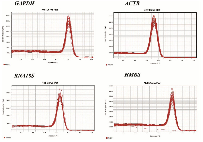 Fig. 1. Melting curve of GAPDH, ACTB, RNA18S, and HMBS genes in the liver and spleen of laying hens. Reference gene stabilityAccording to the geNorm algorithm, a stable reference gene has a M value below 1.5, and in our study, except for the RNA18S gene in the liver (CC) (Fig. 3), all the reference genes were under this value. In the liver, the most stable gene was ACTB, regardless of the production system; and in the spleen, the most stable genes were GAPDH (CC), HMBS (CF), and ACTB (CC-CF) (Table 2). On the other hand, BestKeeper software indicates that the most stable reference gene has a standard deviation (SD) <1, and in the liver, the GAPDH is the most stable gene with an SD of 0.19 (CC), 0.11 (CF), and 0.17 (CC-CF). Furthermore, the genes HMBS (CC and CC-CF) and RNA18S (CF) were stable in the spleen (Table 2). Additionally, NormFinder results showed that ACTB was the stable gene for the liver and spleen in CC-CF. Furthermore, the best combination of genes was ACTB and HMBS for the liver (0.086) and GAPDH and ACTB (0.11) for the spleen (Table 3). DiscussionTranscriptome analysis using technologies such as DNA microarrays, RNA-Seq, and other methods is in demand to evaluate gene expression (Lovén et al., 2012; Hasanpur et al., 2022). However, the qPCR remains a valid and preferred tool to validate the results obtained by transcriptomic analyses (Garrido et al., 2020; Hasanpur et al., 2022). Normalization strategies are needed to achieve accurate results, and reference genes as markers of stability is a common and effective method used for qPCR normalization in the relative quantification method (Vandesompele et al., 2002; Samiullah et al., 2017; Garrido et al., 2020). Nevertheless, the selection and validation of the stability of reference genes for each condition are suggested due to the variation among different experimental conditions and tissues (Wong and Medrano, 2005; Greer et al., 2010; Peng et al., 2018).