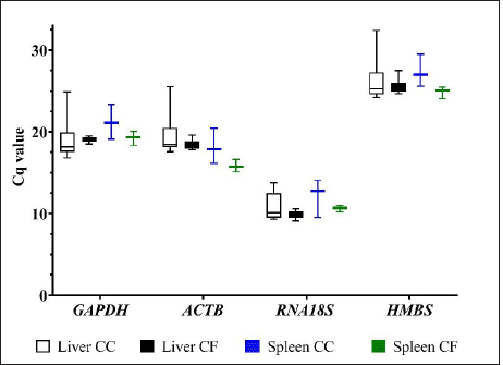 Fig. 2.Cq values for four reference genes, GAPDH, ACTB, RNA18S, and HMBS genes in the liver and spleen of laying hens. The Cq values of the GAPDH, ACTB, RNA18S, and HMBS reference genes from liver CC (white boxes), liver CF (black boxes), spleen CC (blue boxes), and spleen CF (green boxes). The box indicates the 25th and 75th percentiles, the lines represent the median, the squares represent the means, and the whiskers represent the maximum and minimum values.