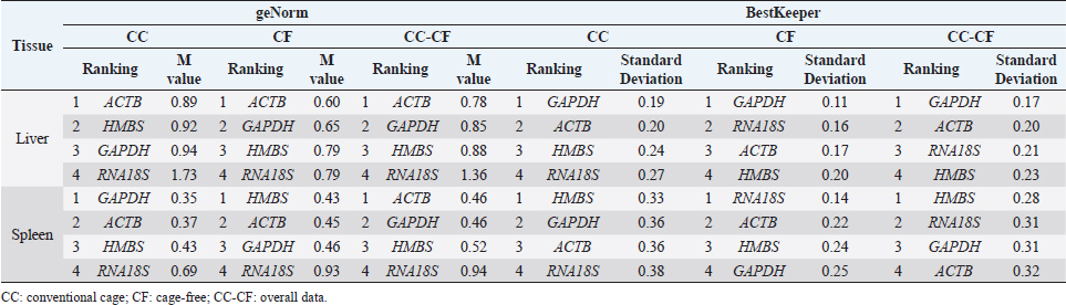 Fig. 3. M value of four candidate reference genes in liver and spleen tissues from laying hens housed in a cage and cage-free systems used the geNorm algorithm. CC: conventional cage; CF: cage-free; CC-CF: overall data. Table 2. Reference gene stability value ranked by geNorm and BestKeeper algorithm in liver and spleen of laying hens of the 80 weeks of production.