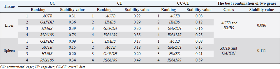 Table 3. Reference gene stability value ranked by NormFinder algorithm in liver and spleen of laying hens of the 80 weeks of production.